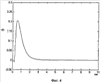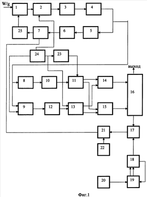 Устройство для измерения ускорений работает следующим образом. При действии ускорения W на чувствительный элемент 1, выполненный в виде маятника, действует инерционный момент, равный mlW (I, m – приведенная длина и масса маятника). Под действием этого момента происходит отклонение чувствительного элемента 1, которое фиксируется датчиком угла 2 обмотки, возбуждения которого соединены с выходом генератора опорного напряжения ГОН 24. Сигнал с датчика угла 2, после усиления предварительным усилителем 3, поступает на вход избирательного усилителя 4, который выделяет сигнал на несущей частоте f1 (ГОН), который затем поступает на вход фильтра верхних частот 5. Сигнал с выхода фильтра 5 поступает на вход преобразователя напряжение-ток 6, а затем на вход первого сумматора 7. Сигнал в виде напряжения ±U4 с усилителя 4 поступает на вход компаратора 8. Напряжение с компаратора 8 поступает на вход первого преобразователя уровня сигнала 10, в котором вырабатывается сигнал в виде напряжения от 0 до ±2.5 (В). Выходные сигналы с ГОН 24 и с выхода избирательного усилителя 4 поступают на вход второго сумматора 9 и суммируются. Сигнал, смещенный по уровню в зависимости от фазы отклонения чувствительного элемента 1, с выхода второго сумматора 9 поступает на вход второго преобразователя уровня сигнала 12, в котором происходит преобразования сигнала на несущей частоте в сигнал постоянного тока. Преобразователи уровня сигнала 10 и 12 выдают необходимый уровень напряжения для работы логических блоков 11 и 13. На второй вход первого логического блока 11 подается сигнал с выхода ГОН 24 через фазовый сдвигатель 23, а на второй вход второго логического блока 13 – с выхода ГОН 24. Первый логический блок 11 осуществляет операцию умножения сигналов с выхода 10 и с выхода 23. Второй логический блок 13 осуществляют операцию умножения сигналов с выхода ГОН 24 и с выхода второго преобразователя уровня 12. Срабатывание логических блоков 11 и 13 осуществляется на несущей частоте ГОН 24 в зависимости от сигнала фазового сдвигателя 23 и от фазы отклонения 1. Фильтр верхних частот 5, включенный в аналоговую отрицательную обратную связь, обеспечивает в устройстве для измерения ускорений заданный переходный процесс (фиг.3 и фиг.4). Выходы первого логического блока 11 соединены с входами первой логической схемы ИЛИ 14 и второй логической схемы ИЛИ 15. Выходы второго логического блока 13 соединены с входами как первой логической схемы ИЛИ 14, так и второй логической схемы ИЛИ 15. В результате логического сложения сигналов схемами 14 и 15, в зависимости от фазы отклонения 1, получим логический “0” либо логическую “1”. Импульсы с 14 или 15 подаются либо на суммирующий вход первого реверсивного двоичного счетчика 16, либо на вычитающий вход 16. Информация равная разности “положительных” и “отрицательных” импульсов с 16 переписывается в двоичный умножитель 17 по импульсу второго реверсивного двоичного счетчика 18, в обратную цепь которого введена третья логическая схема ИЛИ 19. Формирование импульсов счета схемой 19 осуществляется в соответствии с частотой генератора вспомогательной частоты 20, включенного на вход схемы 19. Импульсы с двоичного умножителя 17 поступают на один из входов электронного ключа 21 в соответствии с знаком отклонения чувствительного элемента 1. Другой вход электронного ключа 21 соединен с генер