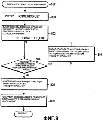 В результате решения на этапе 804, когда выбранный способ позиционирования может использоваться в текущей электроволновой среде терминала 302 назначения, терминал 302 назначения переходит к этапу 806 и извлекает информацию о текущем выбранном способе позиционирования из POSMETHOD_List. Извлеченная информация терминала 302 назначения включает в себя PRIORITET_INDEX порядка приоритета выбранного способа позиционирования и информацию POSMETHOD, включающую в себя различные типы параметров выбранного способа позиционирования, как показано на Фиг.2. Впоследствии терминал 302 назначения переходит к этапу 808 и генерирует сообщение SUPL POS REPORT, включающее в себя извлеченную информацию.
