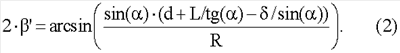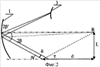 Для определения формы и положения световолоконного экрана 3 относительно сферического зеркала 1, величины его сферических аберраций необходимо провести теоретические расчеты, для чего используем фиг.2, на которой изображена сферическая поверхность зеркала 1 радиусом кривизны R, поверхность световолоконного экрана 3, которую необходимо расчитать, при этом проекция глаза пилота на оптическую ось зеркала находится на расстоянии d от центра кривизны зеркала 1, L – смещение глаза вниз от оси зеркала, что эквивалентно развороту зеркала 1 относительно линии наблюдения горизонта глазами пилота на угол arctg(L/R). В результате расчетов необходимо было определить форму и положение световолоконного экрана 3, при использовании которого при входном зрачке h и угле зрения ±25° сферические аберрации минимальны. Для расчета поверхности световолоконного экрана 3 необходимо через центр хрусталика глаза провести два параллельных идеальных луча света с минимальным отклонением друг от друга , которые после отражения от поверхности зеркала 1 пересекутся на поверхности световолоконного экрана 3. Изменяя угол наклона лучей в диапазоне -25°÷15°, достаточно просто определить форму и положение световолоконного экрана 3. Для расчета сферических аберраций достаточно сравнить форму и положение световолоконной шайбы 3 при малых значениях и значениях h и определить такие параметры оптической схемы, при которых форма и положение световолоконного экрана совпадают.