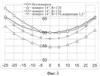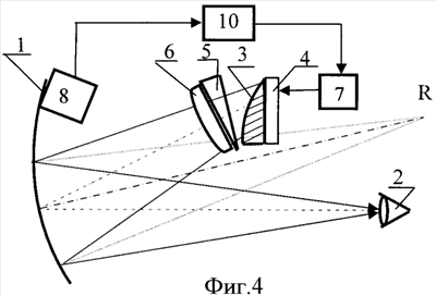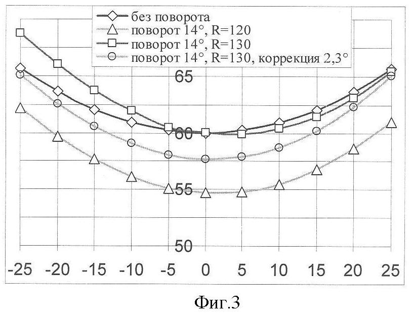 Совмещение изображений в разных плоскостях (сагиттальной и меридиональной) невозможно с помощью каких-либо оптических компенсаторов. Совмещение изображений в разных плоскостях в данном случае возможно, если в сагиттальном сечении увеличить радиус кривизны зеркала 1. На графике 3 фиг.3 представлены форма и положения поверхности световолоконного экрана 3 в случае разворота зеркала в сагиттальной плоскости на угол 14° (L=30), при радиусе кривизны сферического зеркала 130 мм. В связи с этим поверхность коллимирующего зеркала должна иметь тороидальную форму (разный радиус кривизны в сагиттальной и меридиональной плоскостях). Как видно, при использовании подобной коррекции, положение и формы световолоконного экрана 3 в сагиттальной и меридиональной плоскостях совпадают в двух точках, при этом взаимный наклон поверхностей световолоконного экрана в разных плоскостях сохранился.