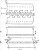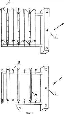 В. Рабочий ход пластин: Положение пластин максимально раскрыто в обе стороны. Угол между ними 90°. Полностью раскрыться не дают ограничители межстержневые, чтобы избежать хаотических движений пластин. На каждую первую половину этих ограничителей укладываются своими краями пластины изогнутой частью по длине. На каждую вторую половину ограничителей ложатся соседние пластины в таком же порядке, в целом создавая настильную ребристую поверхность из всех пар пластин. Изогнутость пластин и ребристость создают прочность сопротивления воде, которые обозначены на фиг.2 стрелкой.
