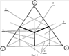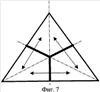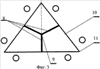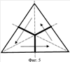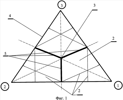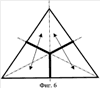 Предлагаемая игра в большой триннис осуществляется при помощи игрового поля 1, выполненного треугольной формы с разметкой 2 (фиг.1), с установленными на нем от центра 3 перпендикулярно боковым сторонам 4 игрового поля 1 тремя сетками 5.