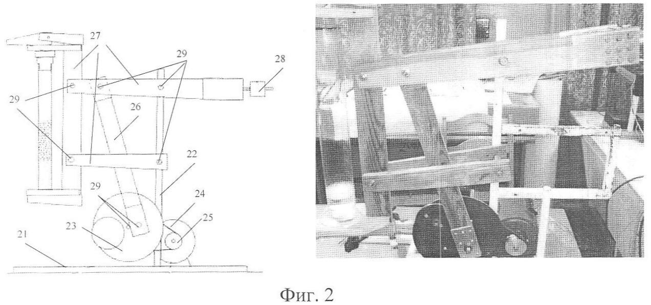 Механизм 2 для преобразования вращательного движения в поступательное состоит из основания 21 (фиг.2) и вертикальной балки 22, обеспечивающих крепление частей механизма 2 при помощи винтов 29, диска 23, связанного ременной передачей 24 с валом 25 двигателя 3, балки 26, механически связывающей край диска 23 и устройство для крепления цилиндра 27 с закрепленным на противоположной от цилиндра стороне противовесом 28.