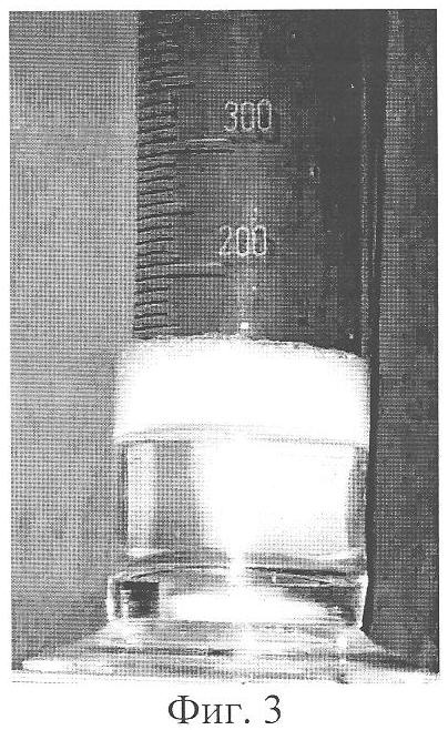 Для получения более качественного изображения столба пены в цилиндре применен блок подсветки 1, состоящий из двух групп белых светодиодов. Первая группа светодиодов, с направленным снизу вверх излучением, расположена под дном цилиндра. Вторая группа закреплена в прозрачной (выполненной из органического стекла) пробке цилиндра, излучение направлено сверху вниз. Каждая группа содержит от трех до пяти светодиодов, в зависимости от их мощности. Совместно группы светодиодов блока подсветки 1 обеспечивают получение контрастного и яркого изображения столба пены (фиг.3) и облегчают процесс автоматического анализа изображения вычислителем 5.