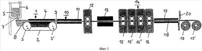 Не показаны устройства для интенсивного охлаждения нижней стороны верхней ветви ленточного транспортера 2 и полный кожух установки 1 с соответствующей атмосферой защитного газа.