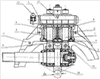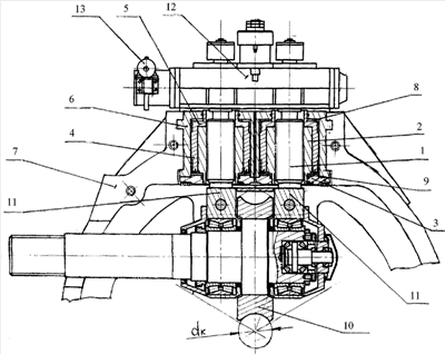 Настройка клети на номинальный требуемый размер калибра dк осуществляется путем радиального перемещения рабочих валков 10 с подшипниковыми опорами 11 нажимными винтами 1, вращение которых в гайке 2 осуществляется через комбинированные редукторы 12 от электродвигателей 13, при этом давление рабочей жидкости в гидроцилиндрах 3 отсутствует. Настройку калибра клети dк возможно осуществлять как в линии прокатного стана, так и вне ее на специальном стенде.
