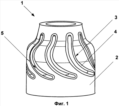 Закладной элемент может занимать только часть отверстия 3 корпуса, при этом форма свободной части 6 боковой стенки отверстия соответствует форме оставшейся части боковой поверхности лопатки (см. Фиг.2). Закладной элемент выполняют описанным образом, если лопатка на части поперечного сечения, формируемой непосредственно стенкой отверстия в корпусе 2, не имеет двойной кривизны.