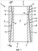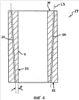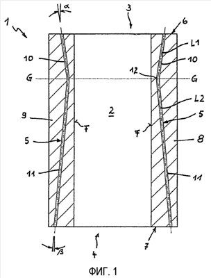 На фиг. 3 показан вид стенки 17 кристаллизатора, имеющего корпус 18. На фиг. 3 показаны два разных профиля охлаждающих каналов 19, 20. Охлаждающий канал 19 показан штриховой линией, а охлаждающий канал 20 – штрих-пунктирной. Каждый канал 19 или 20 имеет два продольных участка 21, 22 или 23, 24, продольные оси L1, L2 которых различно ориентированы друг по отношению к другу. За счет этого по высоте кристаллизатора варьируется расстояние х охлаждающих каналов 19, 20 от поверхности F, контактирующей с расплавленным металлом. Продольный участок 21 охлаждающего канала 19 проходит от верхней стороны 25 стенки 17 кристаллизатора к поверхности F, контактирующей с расплавленным металлом. Продольный участок 22 проходит от нижней стороны 26 стенки кристаллизатора 17 в направлении к поверхности F, контактирующей с расплавленным металлом. Продольные участки 21 и 22 встречаются в изгибе 27.