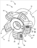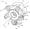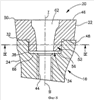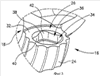 Гнездо под пластину 26 ограничено в основном кольцевой поверхностью 32 и выборкой 34, проходящей вниз от опорной поверхности 32. Выборка 34 имеет периферийную стенку 36, проходящую между опорной поверхностью 32 и базовой поверхностью 38 выборки 34. Периферийная стенка 36 выборки 34 содержит 4 внутренние плоские боковые поверхности 40, соединенные в углах 42. Базовая поверхность 38 выборки 34 имеет резьбовое отверстие 44 с осью В. Резьбовое отверстие 44 расположено в основном перпендикулярно и проходит вниз от базовой поверхности 38 и эксцентрично расположено по отношению к геометрическому центру С выборки 34.