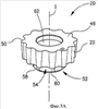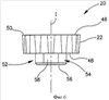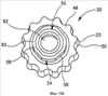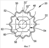 Рассмотрим теперь фиг.5а, 5b, 6 и 7. Режущая пластина 20 на виде сверху выполнена в форме круга с волнистой кромкой с осью симметрии I. Режущая пластина 20 имеет верхнюю переднюю поверхность 46, промежуточную опорную поверхность 48 и волнистую периферийную поверхность 22, расположенную между ними. Волнистая периферийная поверхность 22 пересекает верхнюю переднюю поверхность 46 по волнистой режущей кромке 50. Выступ 52, проходящий вниз от промежуточной опорной поверхности 48, включает наружную поверхность 54, расположенную между промежуточной опорной поверхностью 48 и нижней поверхностью 56. Наружная поверхность 54 выступа 52 имеет четыре плоские боковые поверхности 58, соединенные в углах 60 выступа. Режущая пластина 20 имеет центрально расположенное сквозное отверстие 62, проходящее вниз от верхней передней поверхности 46 к нижней поверхности 56. При размещении выступа 52 в выборке 34 режущая пластина 20 закрепляется на рабочей части 16 корпуса 12 посредством крепежного винта 64, проходящего через сквозное отверстие 62 режущей пластины 20 и взаимодействующего с резьбовым отверстием 44 в выборке 34 гнезда 26.