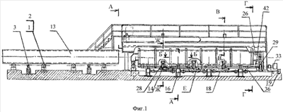 Стан снабжен системой питания и управления 43 приводов. Кроме этого, подъемные транспортные ролики 14 могут быть размещены в корпусах 44 с цилиндрическими направляющими 45, проходящими через втулки скольжения 46 рамы 11 и взаимодействующими с упорами 47, установленными на фундаменте.