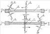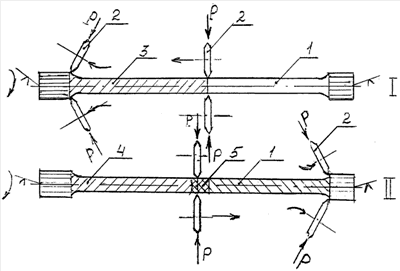 Далее накатные головки 2 отводятся и обработанную наполовину деталь переносят на станок, установленный на позиции II параллельно станку на позиции I, где за отдельную операцию производят обкатку ее второй половины такой же накатной головкой 2 и в вышеизложенной последовательности. Одновременно с накаткой детали на позиции II на позицию I подается новая деталь, где производится обработка ее первой половины, при этом накатные головки 2 на первой и второй позициях перемещают в противоположных направлениях. В процессе обработки длинномерной цилиндрической детали 1 с галтелями перекрытие 5 упрочненной зоны образуют в середине цилиндрического участка 3. По окончании обработки вал с позиции II убирают и устанавливают вместо него обработанный наполовину вал с позиции I, а на последнюю подают новую деталь.