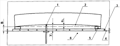 На чертеже показана схема измерения при помощи штангенглубиномера 1 отклонений уi проверяемой поверхности 2, располагаемой на определенном расстоянии В от прямолинейной базы в виде плоскопараллельных реек 3, уложенных вдоль туго натянутой струны 4 и закрепленных на жестком основании 6, по которому перемещаются калиброванные опоры 5 в зависимости от длины измеряемого пиломатериала.
