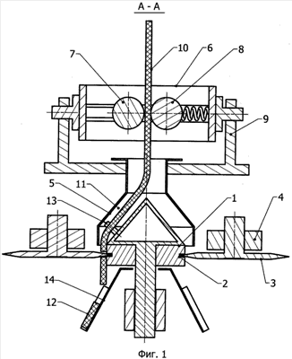 2. Устройство по п.1, отличающееся тем, что коническо-цилиндрический ролик размещен внутри конусообразного кожуха, причем зазор между внутренней поверхностью конического кожуха и наружной поверхностью конической части ролика на 5 мм больше ширины разрезаемой ленты.