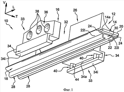 На фиг.1 показана щетка 10 стеклоочистителя типа «плоского скребка» (flat-blade), содержащая держатель 12, установленный в главном продольном направлении с расположенными на нем другими компонентами щетки 10, структурный элемент 14, представляющий собой внутренний стержень в виде продольной горизонтальной пластины, соединительную деталь 16 для соединения щетки 10 стеклоочистителя с приводным кронштейном (не показан) и скребок (не показан).