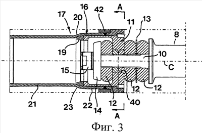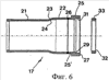 Деформирующаяся трубка 17, которая отдельно показана на фиг.6 и в целом имеет форму цилиндра, имеет задний участок 21, отстоящий от более широкого переднего участка 22 шейкой 23, постепенно сужающейся в виде конуса от более широкого участка 22 к менее широкому участку 21. Понятно, что внутренний диаметр участка 22 превышает внутренний диаметр участка 21. Если говорить более точно, то внутренний диаметр участка 22 может совпадать или очень ненамного превышать наружный диаметр оправки 16, поскольку он изначально определяется максимальным диаметром конуса 19. Однако внутренний диаметр участка 21 значительно меньше наружного диаметра конуса 19. Внутренняя коническая поверхность, которая ограничивает шейку 23, обозначена позицией 24. Угол конусности этой поверхности в предпочтительном случае может соответствовать углу конусности (40°) конической поверхности 20 кольца 19. Однако возможны небольшие различия углов.