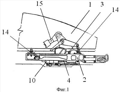 С левой и правой стороны откидная часть 1 фонаря самолета установлена на соответствующих балках 2 подвески с помощью узлов расцепки.