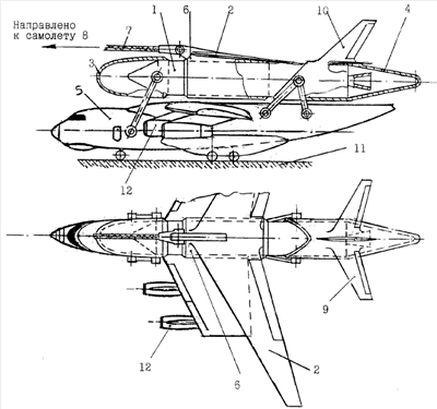 После отрыва самолета 8 от ВПП 11 одновременно от ТРП 5 производится по команде от системы управления отделение ракеты-носителя 1 и начало полета самолета 8 в район пуска ракеты-носителя 1.
