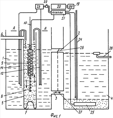 Устройство работает следующим образом. Сточные воды через патрубок 6 поступают в вертикальную трубу 5, где они подвергаются обработке посредством активного ила в присутствии кислорода воздуха, поступающего из мелкопузырчатого аэратора 9, при этом воздух в аэратор подают импульсно. При работе устройства по первому способу мелкопузырчатый аэратор устанавливают в верней зоне трубы и фиксируют его. Затем включают все эрлифты, которыми вода из емкости 1 перекачивается в трубу, т.е. заливается сверху, а так как патрубки установлены тангенциально, то вода, закручиваясь по трубе, опускается вниз, при этом напор воды, дополнительно регулируемый посредством регулятора, такой сильный, что мелкие пузырьки воздуха потоком воды опускаются вниз, тем самым воздух пронизывает весь столб жидкости в трубе, воздух взаимодействует с илом, находящимся во взвешенном состоянии в воде. При достижении воды уровня переливного верхнего патрубка 2 обработанная вода переливается в отстойник 4. В емкости 1 в ее верхней зоне вода находится в успокоенном состоянии, а ил оседает в нижнюю зону емкости, так как весь бурлящий процесс взаимодействия воды ила и воздуха происходит в трубе 5. В отстойнике вода отстаивается и по трубопроводу 26 выводится из устройства.