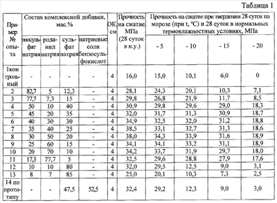Тиосульфат натрия за счет интенсификации гидратационных процессов способствует повышению растворимости минералов цемента (увеличению концентрации ионов Са2+ в суспензии), сокращает сроки твердения и оптимизирует соотношение между гелевой и капиллярной пористостью бетона, в результате чего ускоряются процессы твердения, повышается ранняя и конечная прочность и морозостойкость бетона. Роданид натрия сокращает срок начала твердения цементных растворов и в комплексе с тиосульфатом натрия обеспечивает как небольшое повышение их подвижности, так и сокращение сроков твердения, а также обеспечивает возможность осуществления гидратационных процессов в бетонах и цементных растворах при пониженных температурах (до -15°С). Изменением соотношения количества роданида, тиосульфата и сульфата натрия в водном растворе добавки достигается балансировка между пластичностью, водопотребностью и морозостойкостью бетонной смеси, в результате чего обеспечивается повышение прочности и ранней прочности бетона при нормальных условиях твердения и в условиях пониженных температур до -15°С. В состав заявляемой добавки в небольших количествах могут входить как сопутствующие соли, существенно не влияющие на коррозионную активность цементных растворов по отношению к стальной арматуре и гидратационные процессы при структурообразовании, так и соли – ингибиторы гидратационных процессов в ранние сроки твердения и диспергаторы. Оптимальное соотношение компонентов в составе добавки установлено экспериментально. При увеличении или уменьшении указанного количества тиосульфата, сульфата и роданида натрия в составе добавки снижается прочность бетона как при твердении в нормальных условиях, так и при твердении на морозе. Снижение содержания тиосульфата натрия в составе добавки ниже заявляемого предела приводит к замедлению интенсивности твердения бетона, снижению его морозостойкости. Снижение концентрации роданида натрия приводит к значительному увеличению временного интервала начала твердения при пониженных температурах (до -15°С). Сульфат натрия в заявляемых пределах способствует усилению противоморозного влияния тиосульфата и роданида натрия на структурообразования в цементных растворах и ускоряет структурообразование при нормальных условиях твердения. Повышение содержания в заявляемой в качестве добавки смеси солей одного из компонентов выше заявляемого предела приводит к снижению эффективности ее влияния на прочность при твердении в нормальных и пониженных температурах за счет ослабления взаимодействия компонентов, усиливающего противоморозные характеристики добавки. Использование нового состава и новых концентрационных соотношений в предлагаемой комплексной добавке расширяет область ее применения, например использование ее в качестве противоморозной. Заявляемую комплексную добавку готовят следующим образом. Добавку готовят путем дозирования и смешения водных растворов или сухих солей тиосульфата, роданида и сульфата натрия в пределах заявляемых количеств (возможно использование смеси солей с учетом корректировки химического состава в заявляемых пределах). Компоненты добавки смешивают и дозируют в соответствующую тару для транспортировки потребителю. Пример Для исследования свойств заявляемой доб