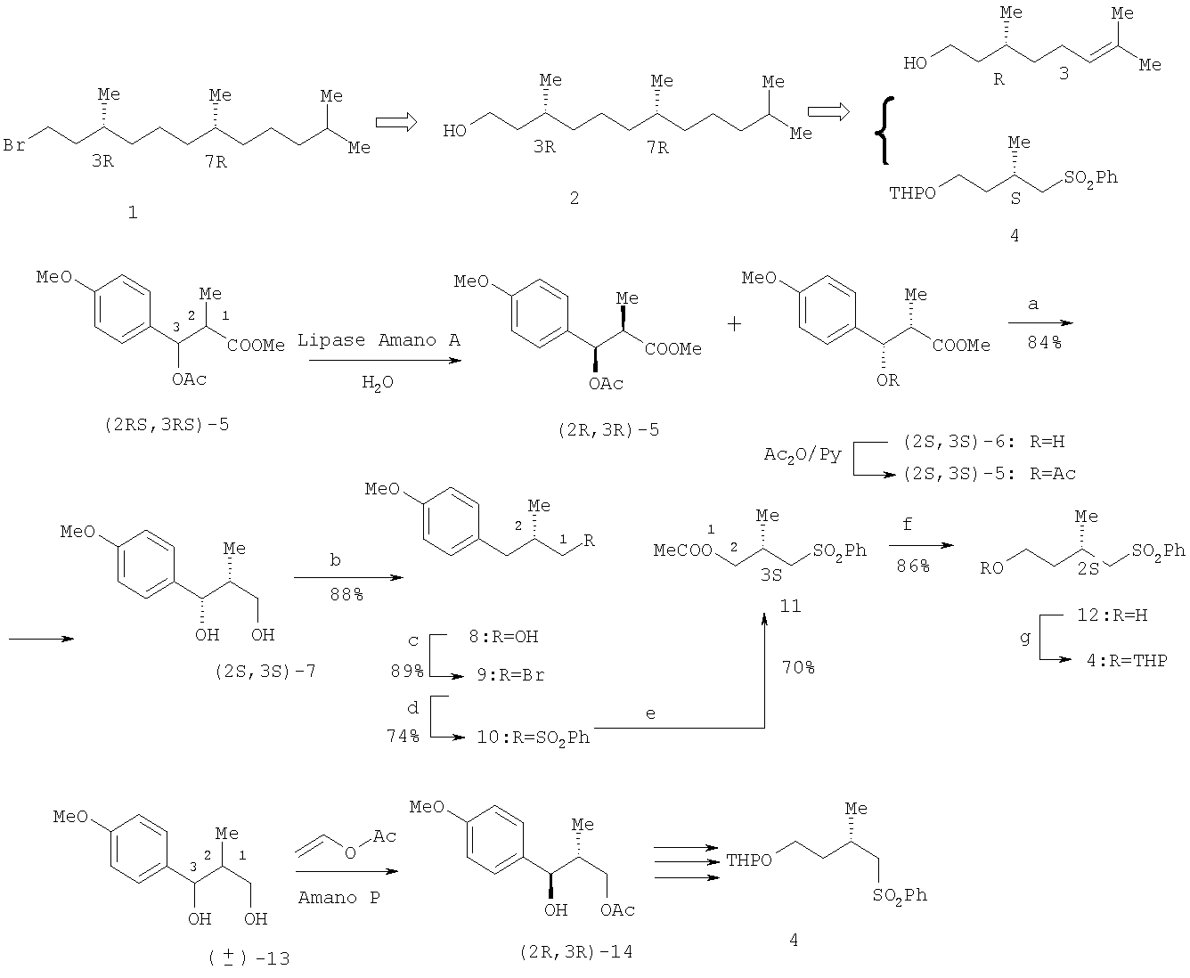 Катализируемый липазой «Amano А» гидролиз (±)-син- -ацетокси- -метилпропионата 5 привел к гладкому кинетическому разделению рацемата на целевой спирт (2S,3S)-6 высокой оптической чистоты [энантиомерный избыток (ее 94%)] и непрореагировавший ацетат (2R,3R)-5. Полученный спирт (2S,3S)-6 подвергли ацетилированию с последующим восстановлением ацетата (2S,3S)-5 в диол (2S,3S)-7, гидрогенолиз которого позволил получить спирт (2S)-8. Его взаимодействие с N-бромсукцинимидом (NBS) привело к бромиду (2S)-9, который обработали фенилсульфонатом натрия (PhSO2Na·2H2O), получив фенилсульфон (2S)-10. Озонолиз 10, протекающий по ароматическому кольцу, и последующая обработка полученной кислоты диазометаном дали эфир (3S)-11, который восстановили LiAlH4 до спирта 12. С целью дифференцирования функциональных групп спиртовую группу защитили, обработав дигидропираном (DHP) в присутствии пиридиний пора-толуолсульфоната (PPTS). Сочетанием сульфона 4 с блок-синтоном, полученным из цитронеллола 3, завершили сборку молекулы (3R,7R)-гексагидрофарнезола 2, который под действием CBr4 трансформировали в целевой бромид 1.