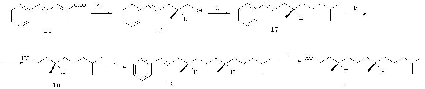 С использованием на ключевой стадии пекарских дрожжей осуществлен энантиоселективный синтез (3R,7R)-гексагидрофарнезола 2 из ненасыщенного альдегида 15. [Fuganti С., Grasselli P. Efficient stereoselective synthesis of natural  19 – P.995-997]. Восстановлением пекарскими дрожжами альдегида 15 получен хиральный (2S,4Е)-2-метил-5-фенилпента-4-ен-1-ол 16, который после превращения в тозилат и сочетания с изопентилмагнийбромидом, катализируемым Li2CuCl4, трансформировали в хиральный углеводород 17. Его озонолиз и восстановительная обработка дали (3R)-3,7-диметилоктан-1-ол 18. Сочетание магнийорганического соединения, полученного из 18 (после его превращения в соответствующий бромид), с тозильным производным спирта 16, дала углеводород 19, который последующими трансформациями, описанными для 17, превратили в целевой спирт (3R,7R)-2 (схема 2).