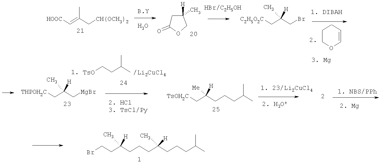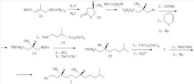 9. – P.290-306.]. Раскрытие лактона 20 действием HBr дало -бромэфир 22. Восстановлением сложноэфирной группы диизобутилалюминийгидридом с последующей обработкой дигидропираном и затем магнием получен реагент Гриньяра 23, сочетание которого с тозилатом 24 привело (после кислотного гидролиза и тозилирования) к соединению 25, превращенному под действием реагента Гриньяра 23 в гексагидрофарнезол 2. Его бромирование N-бромсукцинимидом дало целевой бромид 1 (схема 3).