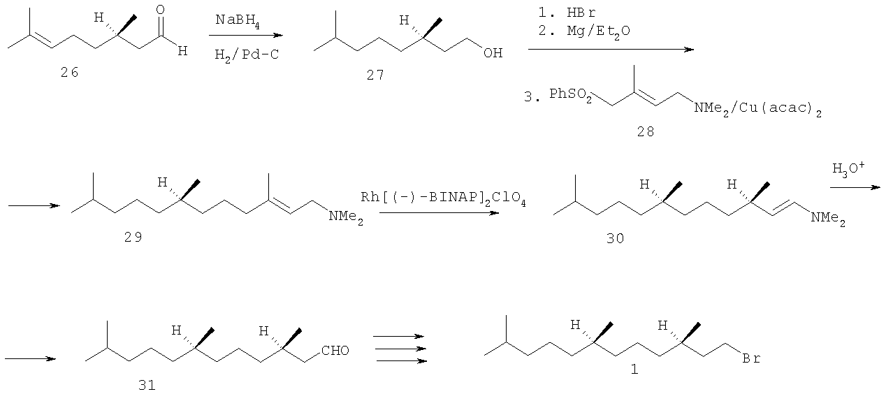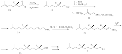 Эта методология была применена в асимметрическом синтезе (3R,7R)-3,7,11-триметилдодеканаля 31, необходимого для получения бромида 1 (схема 4). Исходным материалом служил (R)-цитронеллаль 26, который восстановили NaBH4, а затем гидрировали над Pd-катализатором. (R)-3,7-Диметилоктанол 27 обработали HBr, полученный бромид превратили в соответствующий реагент Гриньяра, который сочетали с E-аминосульфоном 28 в присутствии ацетилацетоната меди (II). Асимметрическую изомеризацию полученного аллиламина 29 в енамин 30 осуществили под действием каталитических количеств катионного комплекса Rh. Кислотный гидролиз енамина 30 дал альдегид 31 с оптической чистотой 97.4% ее.