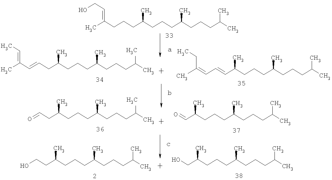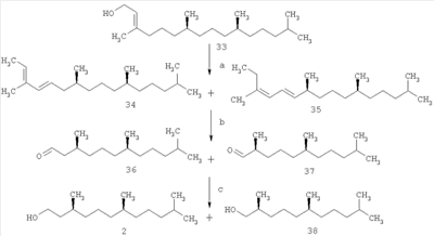В работах [Mayer Н., Schudel P., Rüegg R., Isler O. Uber die chemia des vitamins E. Die total syntheese von (2R,4’R,8’R)- und (2S’,4’R,8’R)- -tocopherol and (2R,3’Е,7’Е)- 1. – P.270-306] синтез изопреноидов 1 и 2 осуществлен из (7R,11R)-фитола 33. Стратегия синтеза строилась на дегидратации фитола под действием фталевого ангидрида и TsOH. Полученную смесь фитадиенов 34 и 35 (оба – смесь (E)- и (Z)-изомеров) озонировали и полученные альдегиды 36 и 37 восстановили в спирты 2 и 38 (2:38=1:3), которые разделили ректификацией. Недостатком данного способа является низкая региоселективность реакции дегидратации и образование трудно разделимых гомологов, что снижает практическую значимость метода (схема 6).