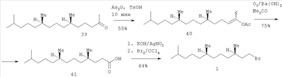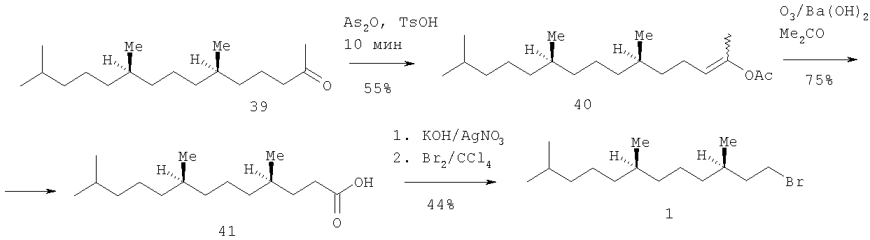 Предлагается новый энантиоселективный короткий способ получения (3R,7R)-гексагидрофарнезилбромида 1, основанный на использовании оптически чистого (6R,10R)-6,10,15-триметилпентадекан-2-она ((R,R)-фитона), полученного из хлорофилла по разработанному нами ранее методу с применением озонолиза [Одиноков В.Н., Маллябаева М.И., Спивак А.Ю., Емельянова Г.А., Джемилев У.М. Новый подход к синтезу (2RS,4’R8’R)- 2. – 201-203]. Сущность изобретения заключается в региоселективном превращении (R,R)-фитона 39 в енолацетат 40 под действием уксусного ангидрида, каталитических количеств кристаллогидрата p-TsOH, при мольном соотношении фитон: Ас2O:TsOH=1.1:4.4:0.08 и при промотировании реакции СВЧ-облучением в микроволновом генераторе домашнего типа при максимальной мощности 750 W в течение 10 мин. Озонолиз енолацетата 40 в ацетоне в присутствии Ba(OH)2 при комнатной температуре привел к С16-кислоте 41. Ее взаимодействие с Br2 по реакции Хунсдикера в ее классическом варианте через серебряную соль кислоты дает оптически чистый бромид 1. Общий выход бромида 1 в расчете на фитон 39 составил 11%.