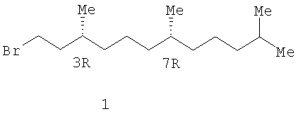 (3R,7R)-Гексагидрофарнезилбромид 1 получают бромированием природного сесквитерпенола – (R,R)-гексагидрофарнезола ((3R,7R)-3,7,11-триметил-1-додеканола) 2, синтез которого базируется на сочетании С4-, С5– и С10