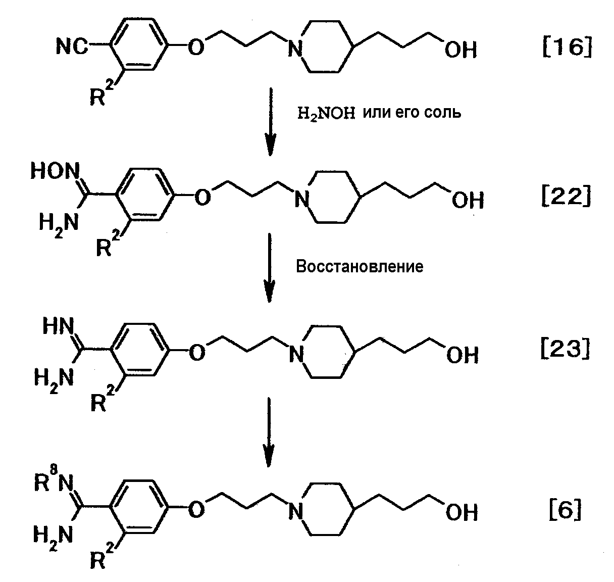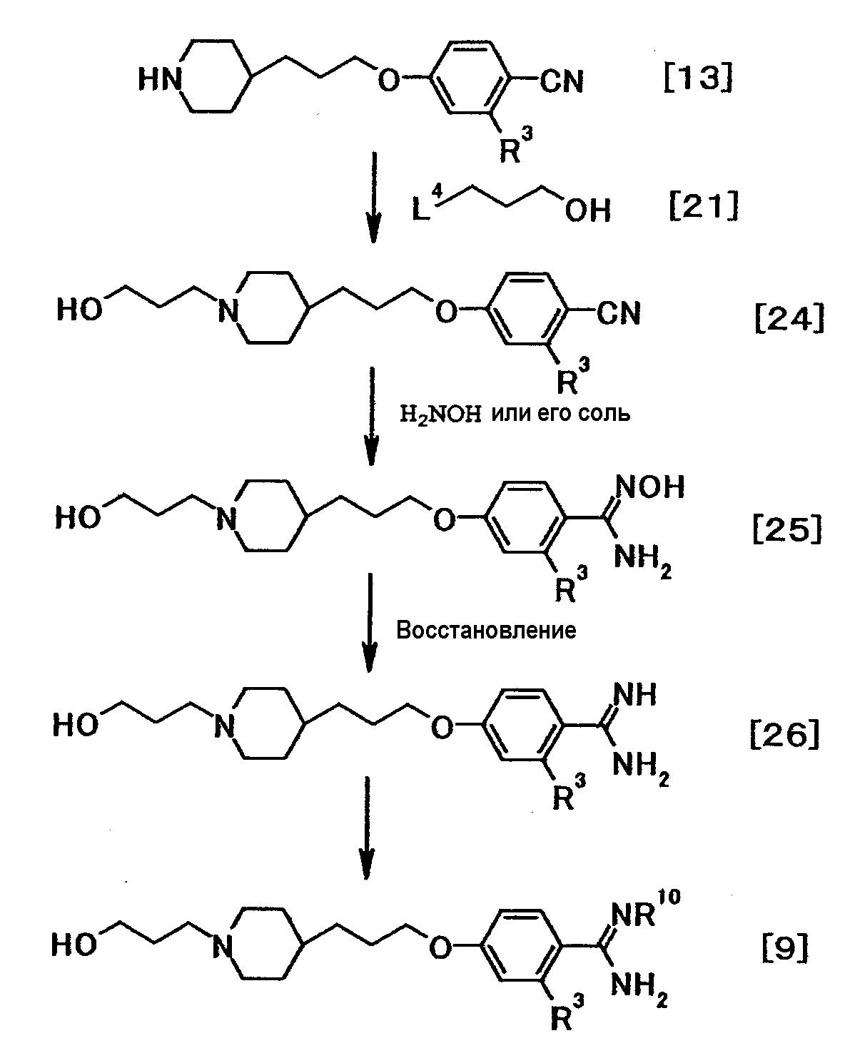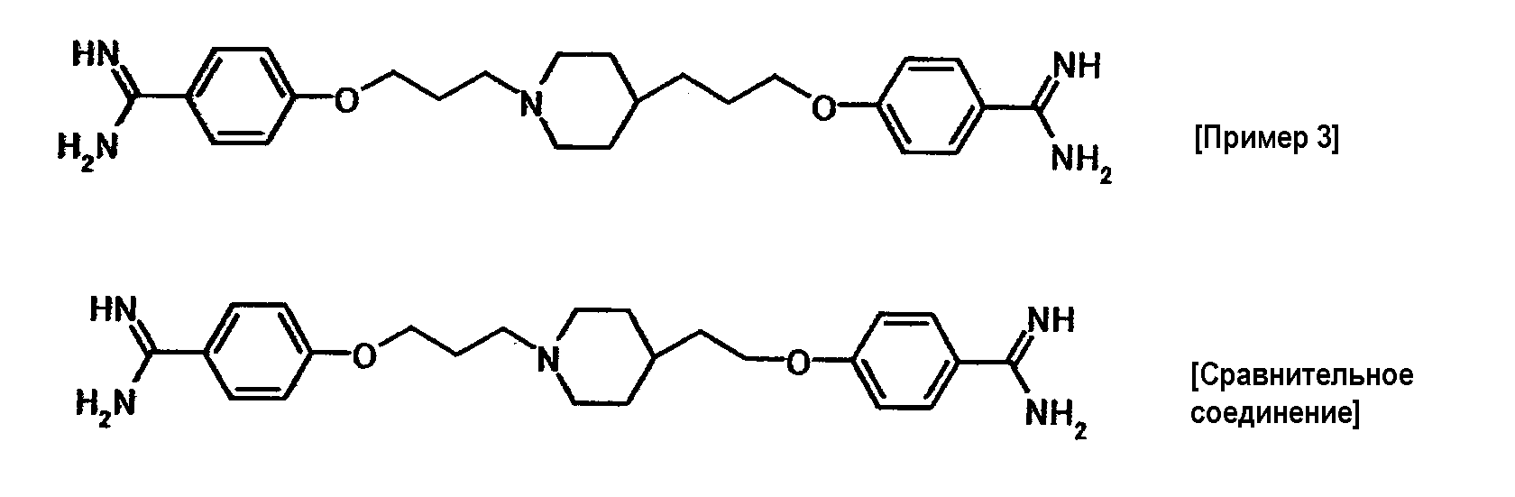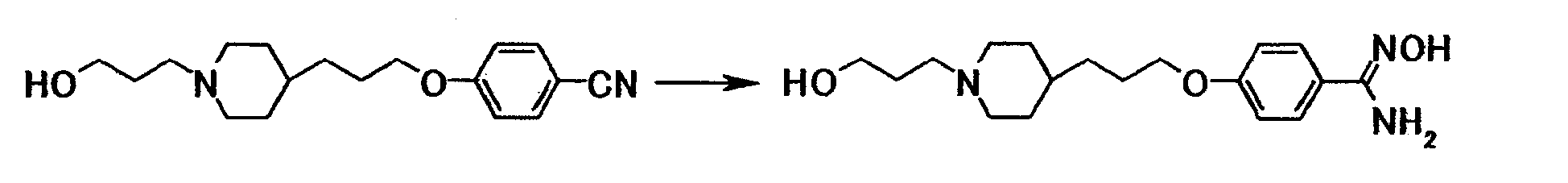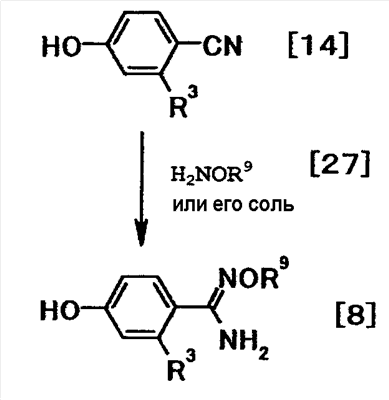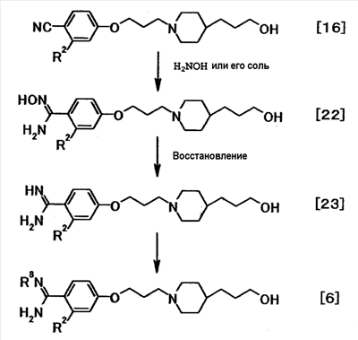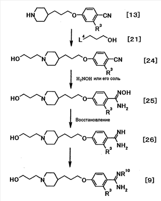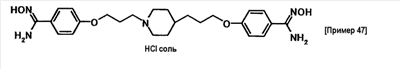 К суспензии 0,50 г трет-бутил[1-амино-1-(4-{3-[1-(3-{4-[амино(гидроксиимино)метил]фенокси}пропил)-4-пиперидинил]пропокси}фенил)метилиден]карбамата в этаноле (5 мл) добавляли при комнатной температуре 1 мл хлористоводородной кислоты, полученную смесь затем перемешивали при указанной температуре в течение 15 часов и 30 минут. К реакционной смеси добавляли при комнатной температуре 4 мл хлористоводородной кислоты, затем смесь перемешивали при указанной температуре в течение 2 часов и 30 минут. Растворитель отгоняли при пониженном давлении и затем добавляли воду с последующим доведением до pH 12,5 при помощи 5 моль/л водного раствора гидроксида натрия. Осадок собирали фильтрованием и промывали водой. Полученное твердое вещество растворяли в 1 моль/л хлористоводородной кислоте с последующей отгонкой растворителя при пониженном давлении, а затем очисткой при помощи колоночной хроматографии на силикагеле (силикагель: ODS-A от YMC, элюент; вода:этанол = 95:5). Элюат концентрировали до около 20 мл, полученную смесь затем доводили до pH 12 при помощи 5 моль/л водного раствора гидроксида натрия. Осадок собирали фильтрованием и промывали водой с получением 0,17 г 4-{3-[4-(3-[4–[амино(имино)метил]фенокси}пропил)-1-пиперидинил]пропокси}-N’-гидроксибензамидина в виде белого твердого вещества.