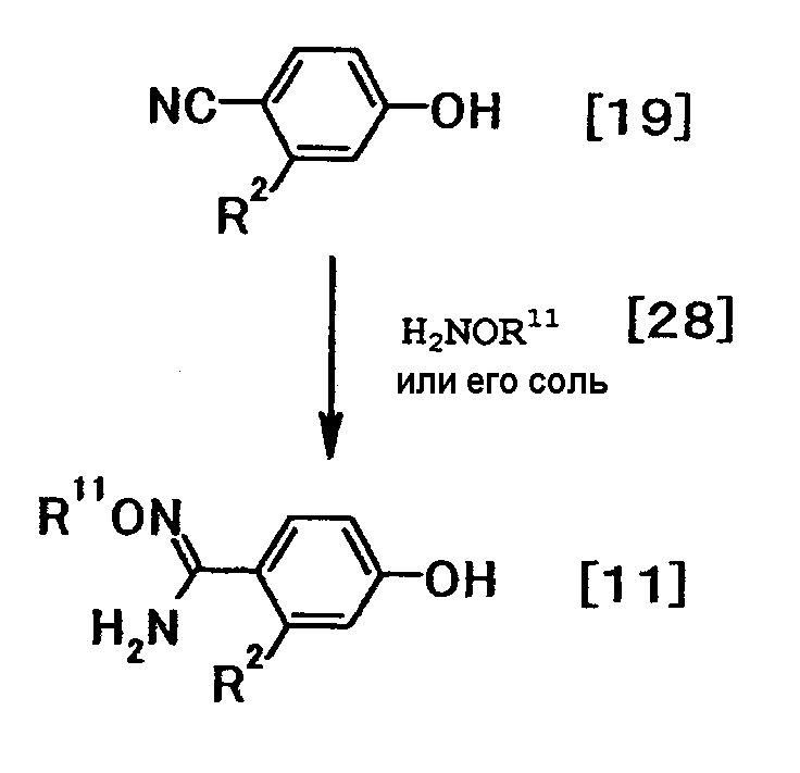 К раствору 0,93 г бензил[1-амино-1-(4-{3-[4-(3-гидроксипропил)-1-пиперидинил]пропокси}фенил)метилиден]карбамата в тетрагидрофуране (20 мл) добавляли при комнатной температуре 0,37 мл триэтиламина, затем к полученной смеси при охлаждении льдом добавляли 0,19 мл метансульфонилхлорида с последующим перемешиванием при комнатной температуре в течение 30 минут. К реакционной смеси добавляли этилацетат, воду и насыщенный водный раствор хлорида натрия. Органический слой отделяли и сушили при помощи безводного сульфата магния с последующей отгонкой растворителя при пониженном давлении. Полученное маслянистое вещество растворяли в 20 мл N,N-диметилформамида, затем к полученной смеси добавляли 0,25 г N’,4-дигидроксибензамидина и 0,45 г карбоната калия с последующим перемешиванием при 70°C в течение 4 часов. К смеси добавляли 0,12 г N’,4-дигидроксибензамидина и затем перемешивали при 70°C в течение одного часа. Реакционную смесь охлаждали до комнатной температуры и затем добавляли к смеси этилацетата и воды. Органический слой отделяли, промывали водой, затем сушили при помощи безводного сульфата магния с последующей отгонкой растворителя при пониженном давлении. Полученный остаток суспендировали в диизопропиловом эфире и твердое вещество собирали фильтрованием и очищали, используя колоночную хроматографию на силикагеле (элюент; хлороформ:метанол =5:1), с получением 0,22 г бензил[1-амино-1-(4-{3-[4-(3-{4- [амино(гидроксиимино)метил]фенокси}пропил)-1-пиперидинил]пропокси}фенил)метилиден]карбамата в виде белого твердого вещества.