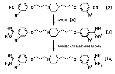 Соединение общей формулы (1a) можно получить путем взаимодействия соединения общей формулы (2) с соединением общей формулы (4) с преобразованием в соединение общей формулы (3), с последующим взаимодействием соединения общей формулы (3) с аммиаком или солью аммония. Эту реакцию можно осуществить способом, описанным, например, в W096/16947 и J. Org. Chem., 64:12-13, 1999, или аналогичным способом.