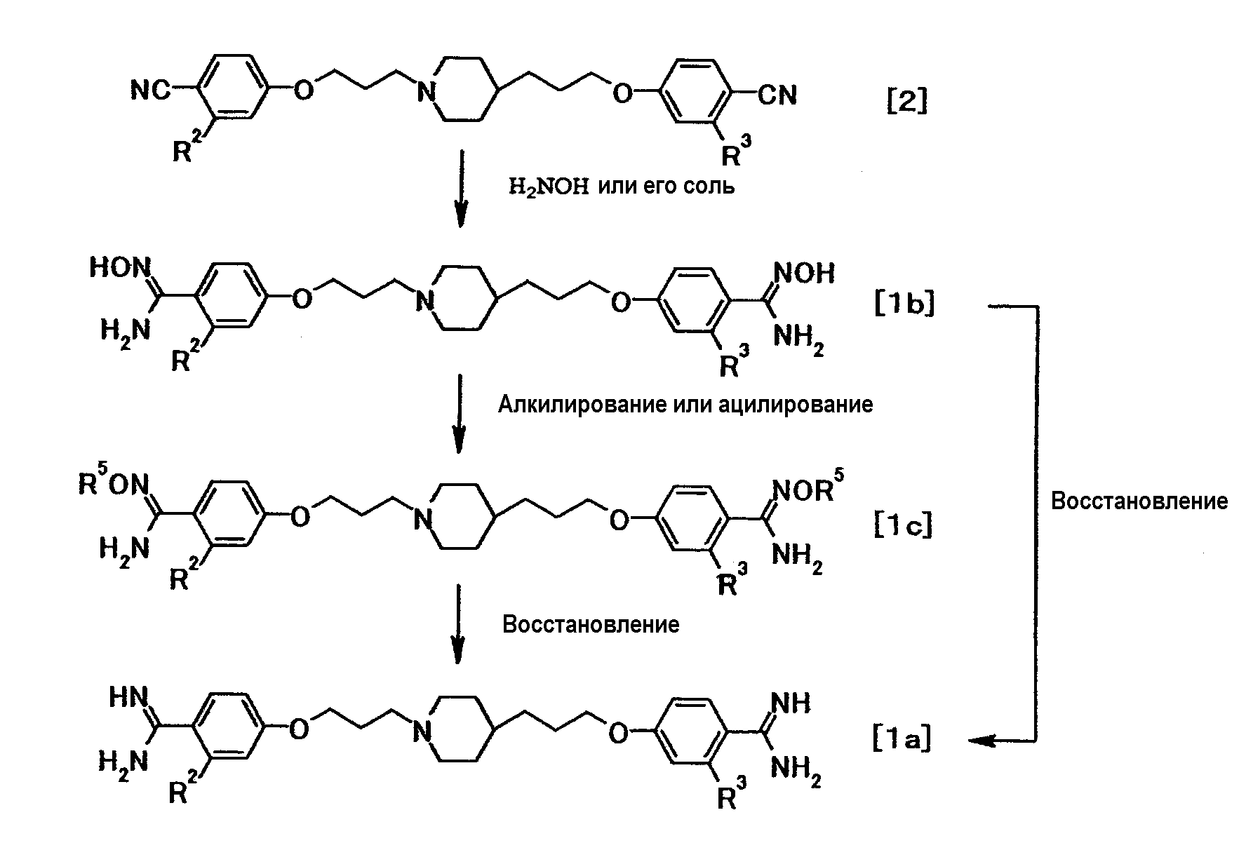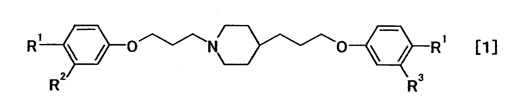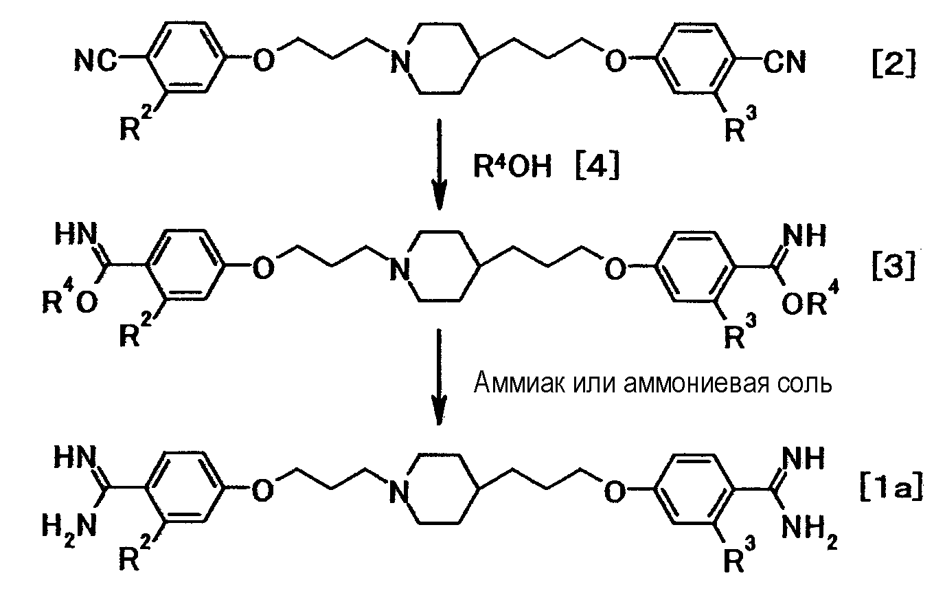 где R1 представляет собой амидиногруппу, необязательно замещенную одной или несколькими группами, представляющими ацильную группу; алкилоксикарбонильную группу; аралкилоксикарбонильную группу; арилоксикарбонильную группу; циклоалкилоксикарбонильную группу; алкоксиалкильную группу; циклоалкилиденовую группу; гидроксильную группу, необязательно замещенную ацильной группой; алкокси, и аралкилоксигруппы, необязательно замещенные галогеном, алкильной группой, алкоксигруппой, алкоксиалкильной группой, аминогруппой; и R2 и R3 являются одинаковыми или отличными друг от друга, и каждый представляет собой атом водорода или атом галогена; или к его соли. Изобретение также относится к 4-{3-[4-(3-{4-[амино(имино)метил]фенокси}пропил)-1-пиперидинил]пропокси}бензамидину, 4-{3-[4-(3-{4-[амино(имино)метил]фенокси}пропил)-1-пиперидинил]пропокси}бензамидину тригидрохлорид пентагидрату, 4-{3-[4-(3-{4-[амино(гидроксиимино)метил] фенокси} пропил)-1-пиперидинил]пропокси}бензамидоксиму или к их солям, а также к противогрибковому средству. Технический результат – получение новых биологически активных соединений, обладающих противогрибковой активностью. 5 н. и 2 з.п. ф-лы, 5 табл., 1 ил.