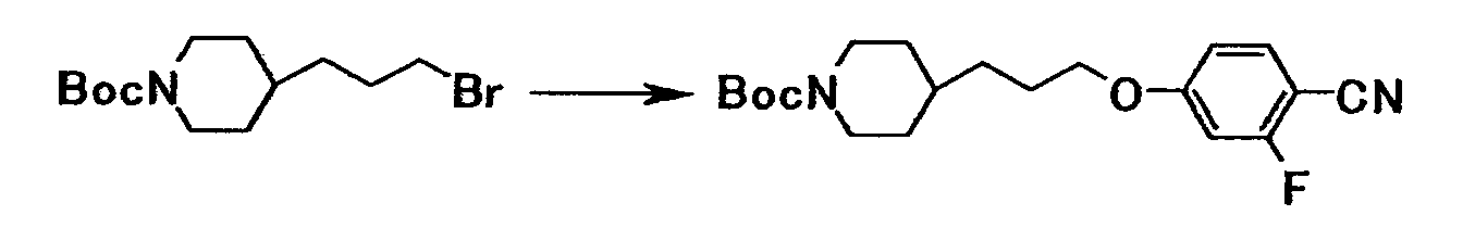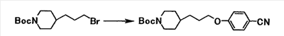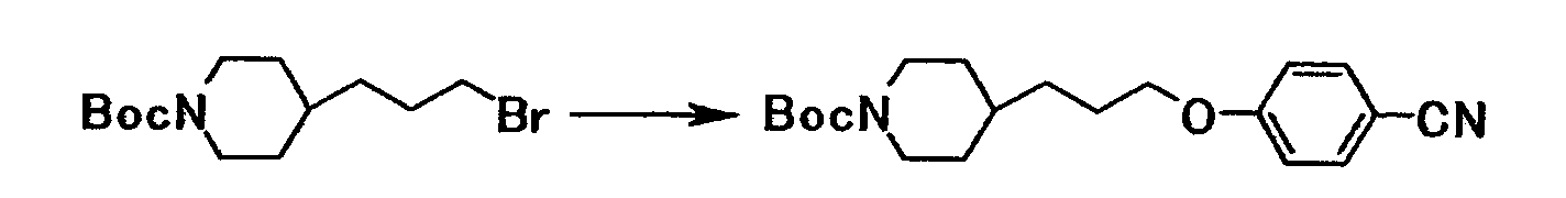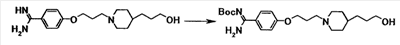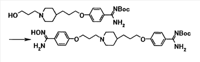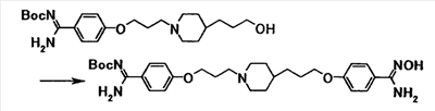 К суспензии 1,59 г трет-бутил[1-амино-1-(4-{3-[1-(3-гидроксипропил)-4-пиперидинил]пропокси}фенил)метилиден]карбамата в тетрагидрофуране (20 мл) добавляли при комнатной температуре 10 мл метиленхлорида и 0,63 мл триэтиламина. К полученной смеси добавляли по каплям при охлаждении льдом 0,35 мл метансульфонилхлорида, затем смесь перемешивали при комнатной температуре в течение 20 минут. К реакционной смеси добавляли хлороформ и воду. Органический слой отделяли, промывали насыщенным водным раствором хлорида натрия и затем сушили при помощи безводного сульфата магния с последующей отгонкой растворителя при пониженном давлении. Полученный остаток растворяли в 20 мл N,N-диметилформамида, затем к полученной смеси добавляли 1,05 г карбоната калия и 0,58 г N’,4-дигидроксибензамидина с последующим перемешиванием при температуре от 60 до 70°C в течение одного часа. Реакционную смесь охлаждали до комнатной температуры, затем к полученной смеси добавляли хлороформ и воду, а затем осадок собирали фильтрованием с получением 2,23 г трет-бутил[1-амино-1-(4-{3-[1-(3-{4-[амино(гидроксиимино)метил]фенокси}пропил)–4–пиперидинил]пропокси}фенил}метилиден]карбамата в виде белого твердого вещества.