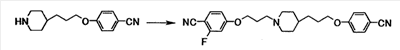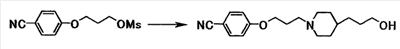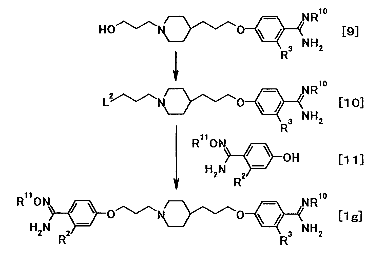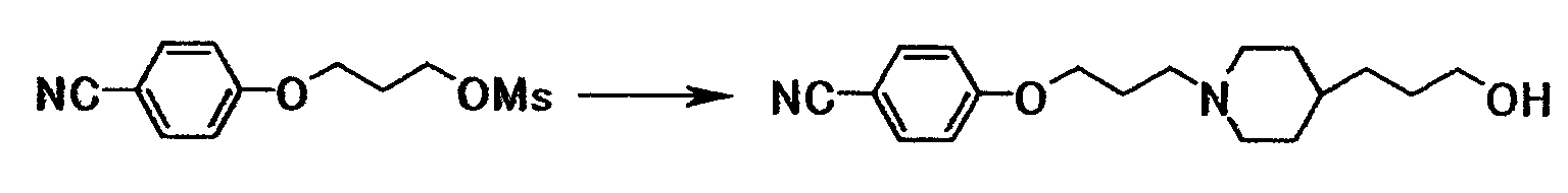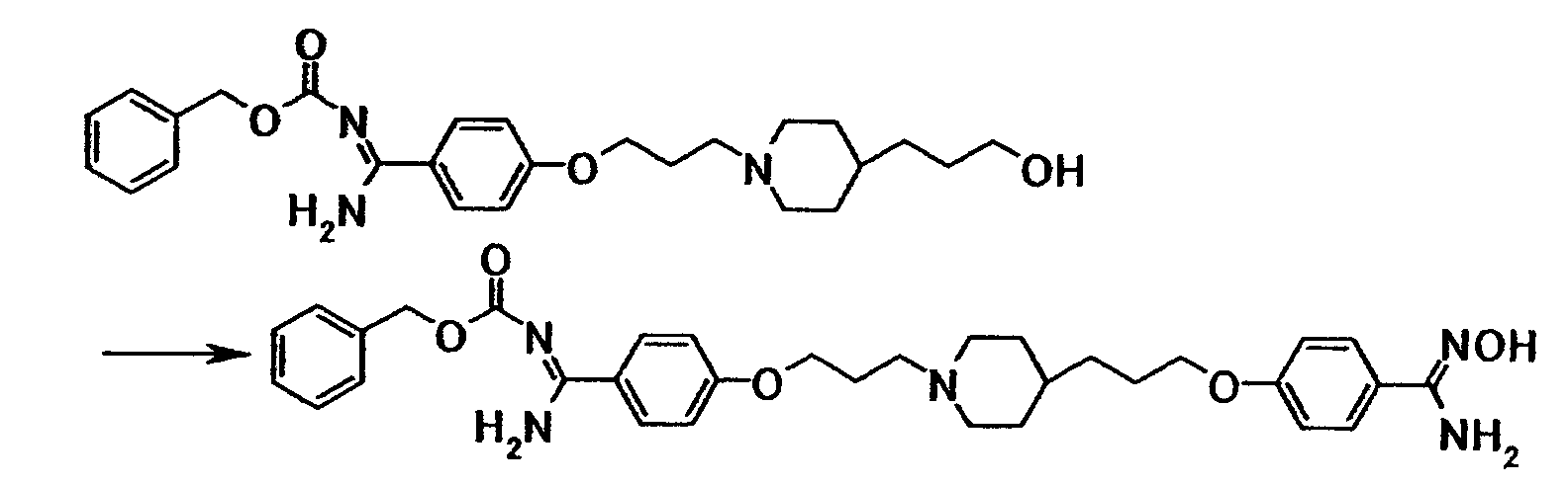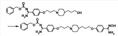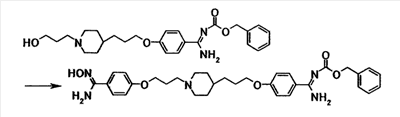 К раствору 1,06 г бензил[1-амино-1-(4-{3-[1-(3-гидроксипропил)–4–пиперидинил]пропокси}фенил)метилиден]карбамата в тетрагидрофуране (10 мл) добавляли при охлаждении льдом 0,39 мл триэтиламина. К смеси добавляли по каплям 0,22 мл метансульфонилхлорида, затем смесь перемешивали при указанной температуре в течение 15 минут. К реакционной смеси добавляли хлороформ и воду. Органический слой отделяли, промывали насыщенным водным раствором хлорида натрия, затем сушили при помощи безводного сульфата магния с последующей отгонкой растворителя при пониженном давлении. Полученный остаток растворяли в 20 мл N,N-диметилформамида, к смеси затем добавляли 0,36 г N’,4-дигидроксибензамидина и 0,65 г карбоната калия с последующим перемешиванием при 60°C в течение 40 минут. Реакционную смесь охлаждали до комнатной температуры, затем к полученной смеси добавляли этилацетат и 5% водный раствор карбоната калия. Осадок собирали фильтрованием и промывали последовательно водой и этилацетатом с получением 0,55 г бензил[1-амино-1-(4-{3-[1-(3-{4-[амино(гидроксиимино)метил]фенокси}пропил)–4–пиперидинил]пропокси}фенил)метилиден]карбамата в виде белого твердого вещества.
