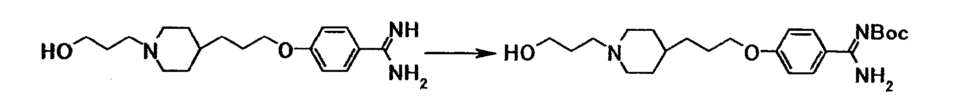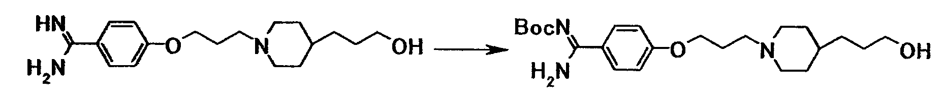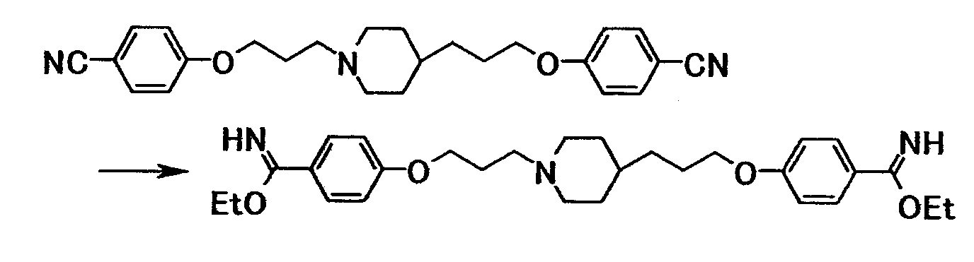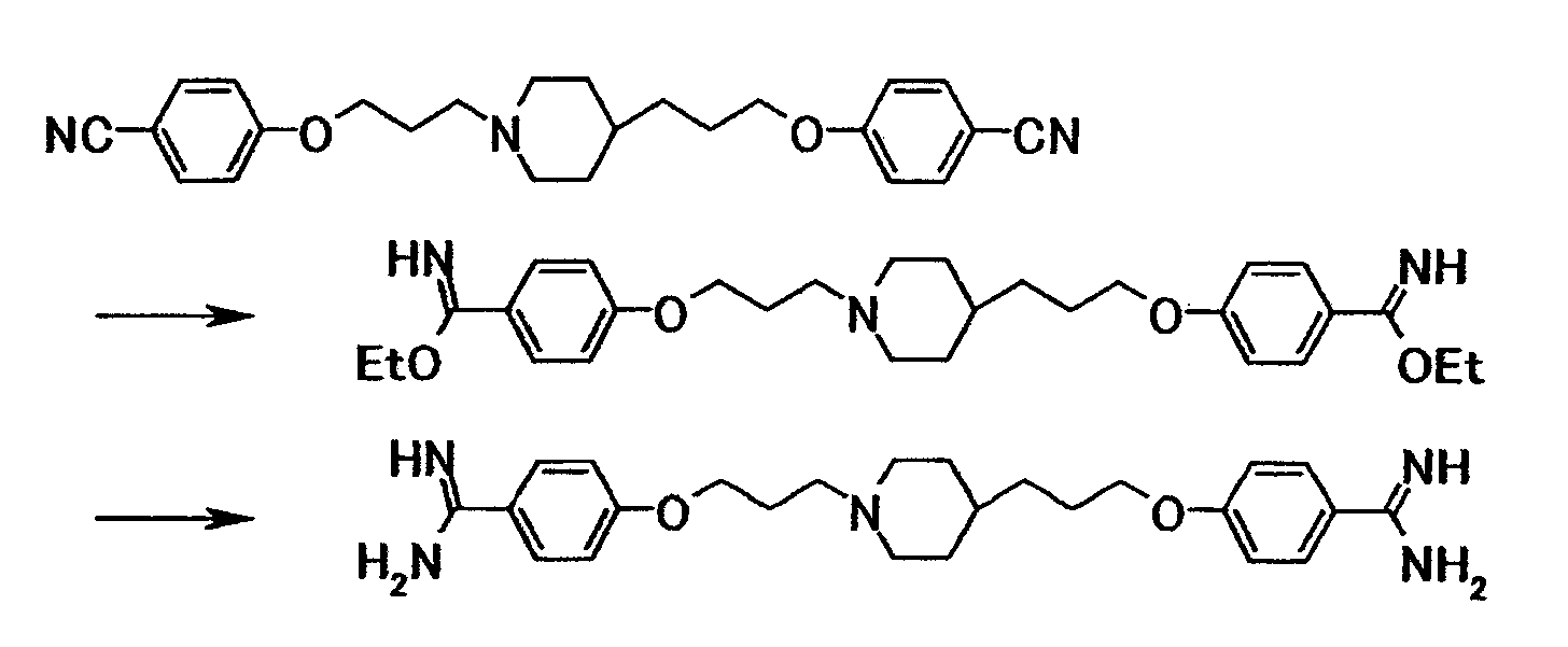 Как описано в примере 31, получали 0,23 г 4-{3-[4-(3-{4-[амино(пентилоксикарбонилимино)метил]фенокси}пропил)-1-пиперидинил}пропокси}-N’-(пентилоксикарбонил)бензамидина в виде белого твердого вещества, исходя из 0,50 г 4-{3-[4-(3-{4-[амино(имино)метил]фенокси}пропил)-1-пиперидинил]пропокси}бензамидина и 1,20 г 4–нитрофенил-пентилкарбоната.