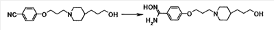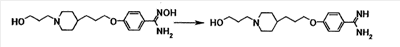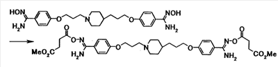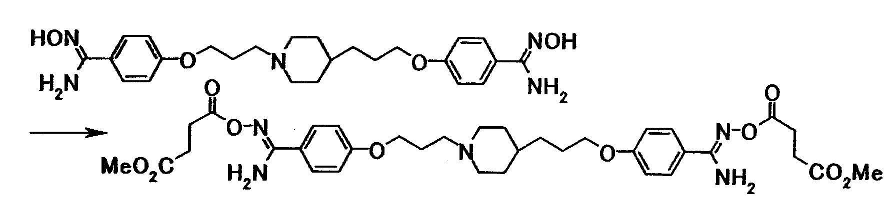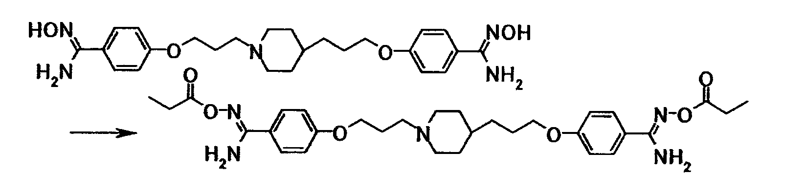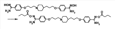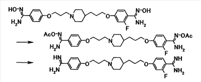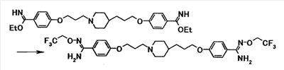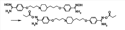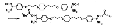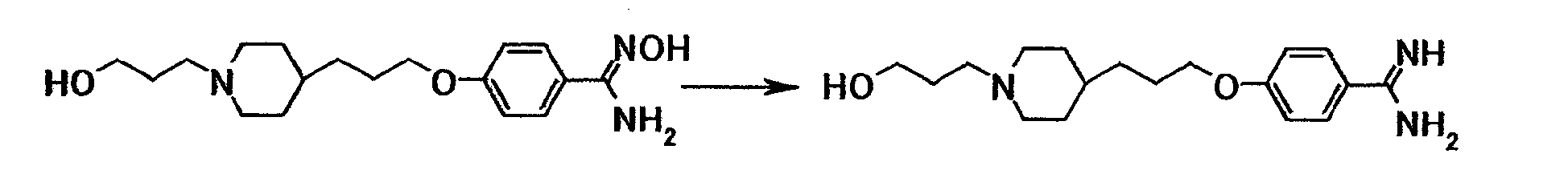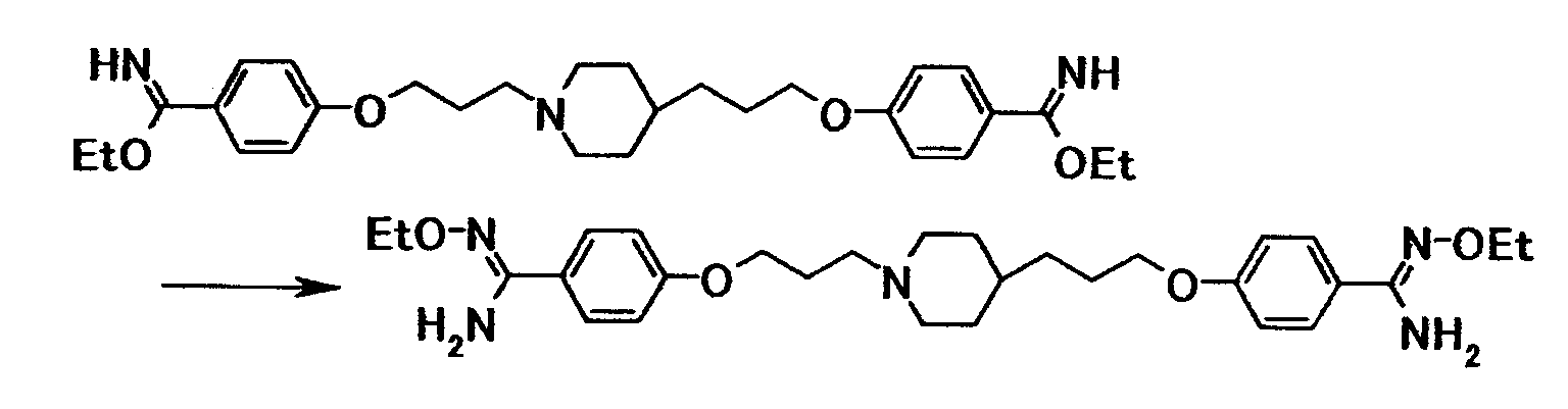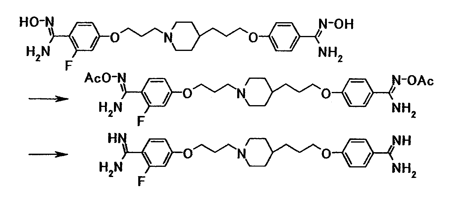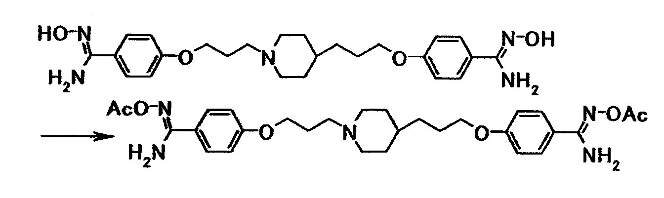 К суспензии 1,00 г 4-{3-[4-(3-{4-[амино(гидроксиимино)метил]фенокси}пропил)-1-пиперидинил]пропокси}бензамидоксима в уксусной кислоте (15 мл) добавляли при комнатной температуре 0,48 мл уксусного ангидрида, полученную смесь затем перемешивали при указанной температуре в течение одного часа. Растворитель отгоняли при пониженном давлении и затем полученный остаток добавляли к смеси воды и хлороформа, полученную смесь затем доводили до pH 7,5 при помощи насыщенного водного раствора бикарбоната натрия. Осадок собирали фильтрованием и промывали водой и хлороформом с получением 1,07 г 4-{3-[4-(3-{4-[амино(ацетилоксиимино)метил]фенокси}пропил)-1-пиперидинил]пропокси}бензамид О-ацетилоксима в виде белого твердого вещества.