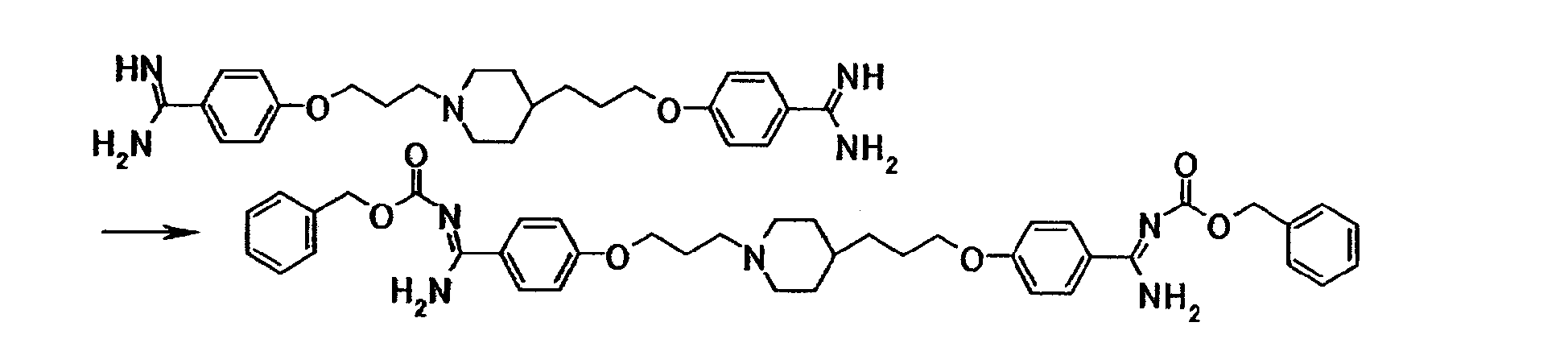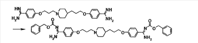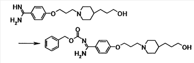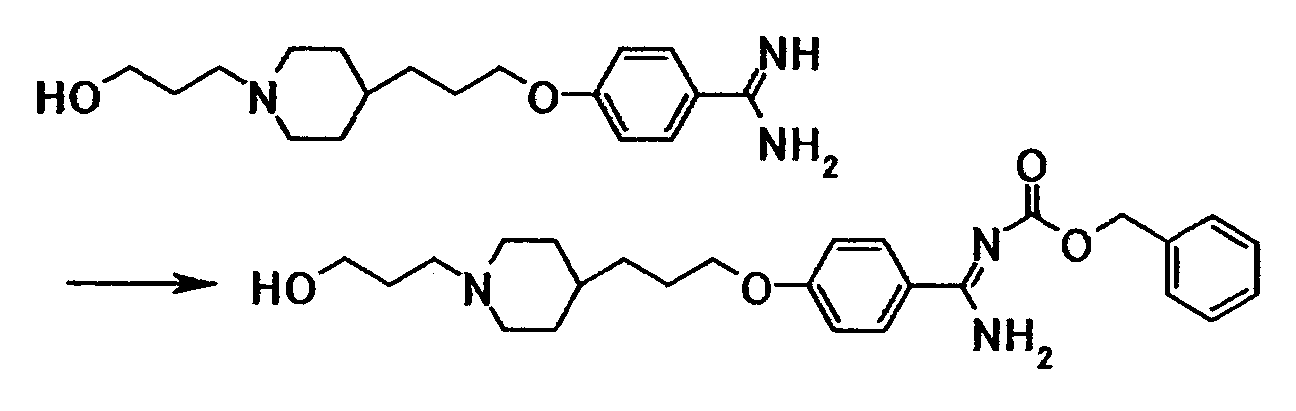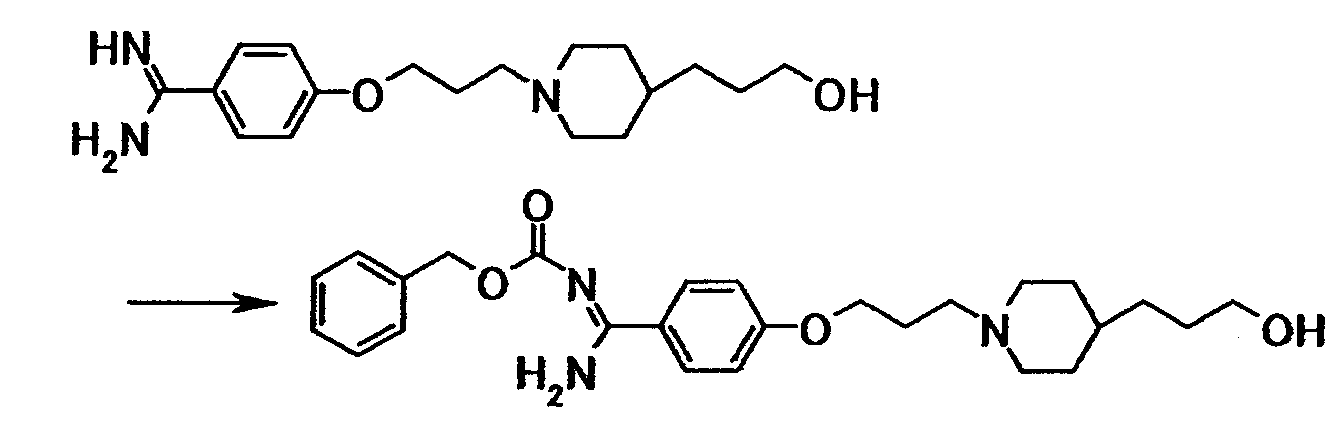 К суспензии 0,50 г 4-{3-[4-(3-{4-[амино(имино)метил]фенокси}пропил)-1-пиперидинил]пропокси}бензамидина в N,N-диметилформамиде (10 мл) добавляли при комнатной температуре 0,78 г бензил-4-нитрофенилкарбоната, полученную смесь затем перемешивали при указанной температуре в течение 50 минут. К реакционной смеси добавляли хлороформ и воду. Органический слой отделяли, промывали последовательно 5% водным раствором карбоната калия и насыщенным водным раствором хлорида натрия, затем сушили при помощи безводного сульфата магния с последующей отгонкой растворителя при пониженном давлении. Полученный остаток очищали, используя колоночную хроматографию на силикагеле (элюент; хлороформ:метанол = 4:1), с получением 0,67 г 4-{3-[4-(3-{4-[амино-(бензилоксикарбонилимино)метил]фенокси}пропил)-1-пиперидинил]пропокси}-N’-(бензилоксикарбонил)бензамидина в виде белого твердого вещества.