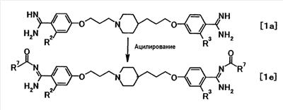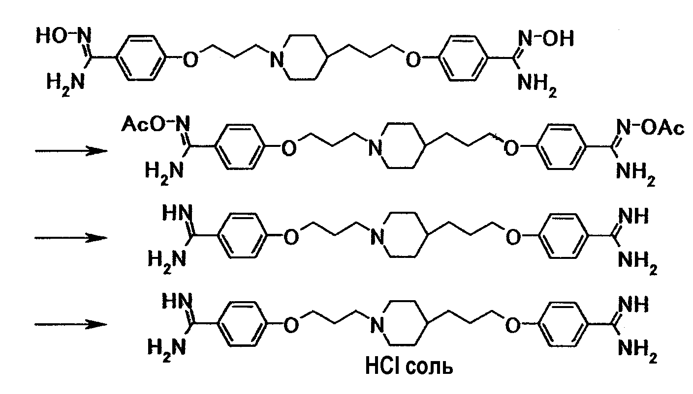 К суспензии 1,00 г 4-{3-[4-(3-{4–[амино(имино)метил]фенокси}пропил)-1-пиперидинил]пропокси}бензамидина в N,N-диметилформамиде (10 мл) добавляли при комнатной температуре 4–нитрофенилацетат, полученную смесь затем перемешивали при указанной температуре в течение 1 часа и 15 минут. К реакционной смеси добавляли хлороформ и 5% водный раствор карбоната калия и нерастворимое вещество отфильтровывали. Органический слой отделяли, промывали последовательно 5% водным раствором карбоната калия и насыщенным водным раствором хлорида натрия и затем сушили при помощи безводного сульфата магния с последующей отгонкой растворителя при пониженном давлении. К полученному остатку добавляли этилацетат и воду, полученную смесь затем доводили до pH 3,0 при помощи хлористоводородной кислоты. Водный слой отделяли и промывали этилацетатом, полученную смесь затем доводили до pH 12,0 при помощи водного раствора гидроксида натрия. Осадок собирали фильтрованием с получением 0,80 г N’-ацетил-4-{3-[4-(3-{4-[(ацетилимино)(амино)метил]фенокси}пропил)-1-пиперидинил]пропокси}бензамидина в виде белого твердого вещества.