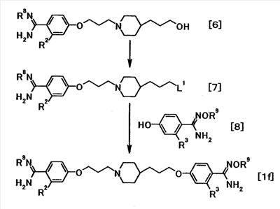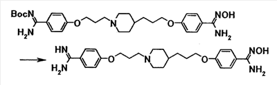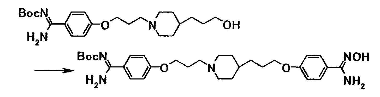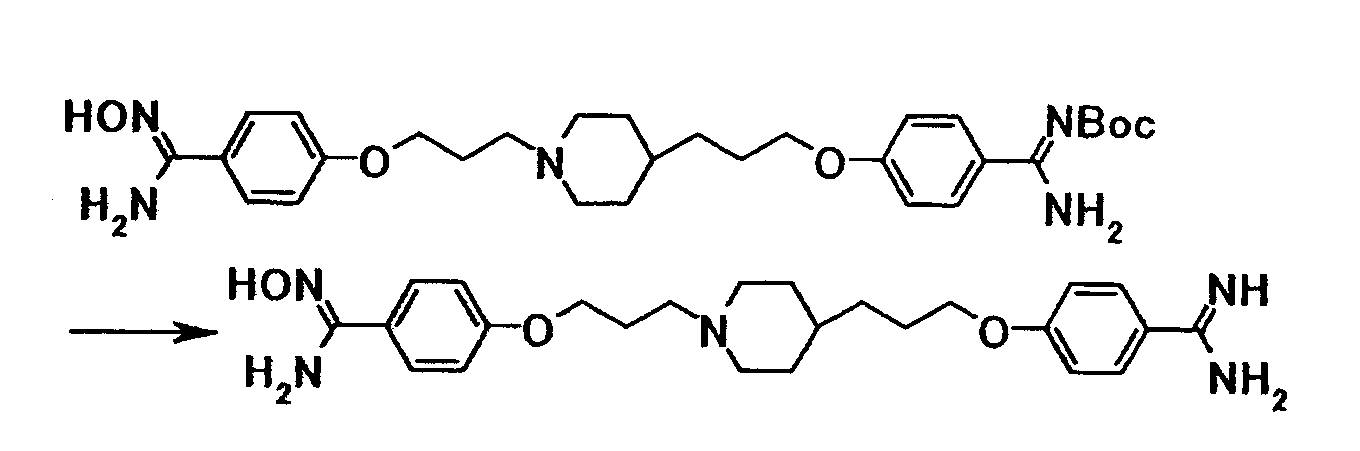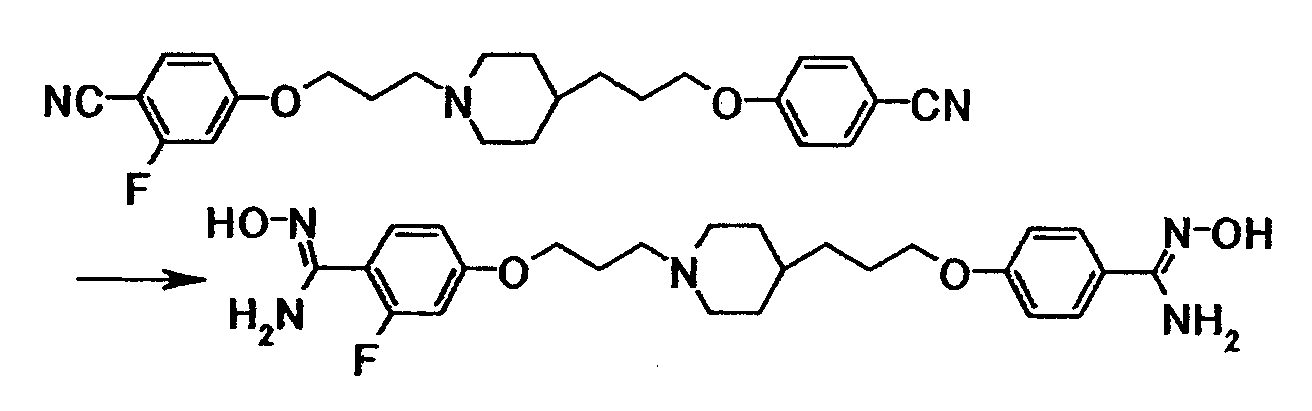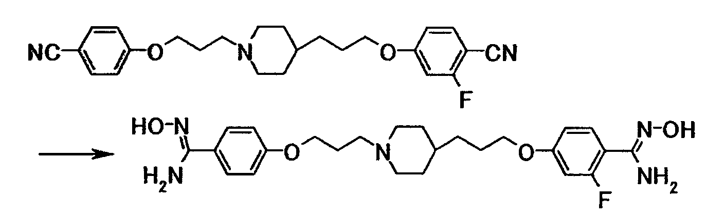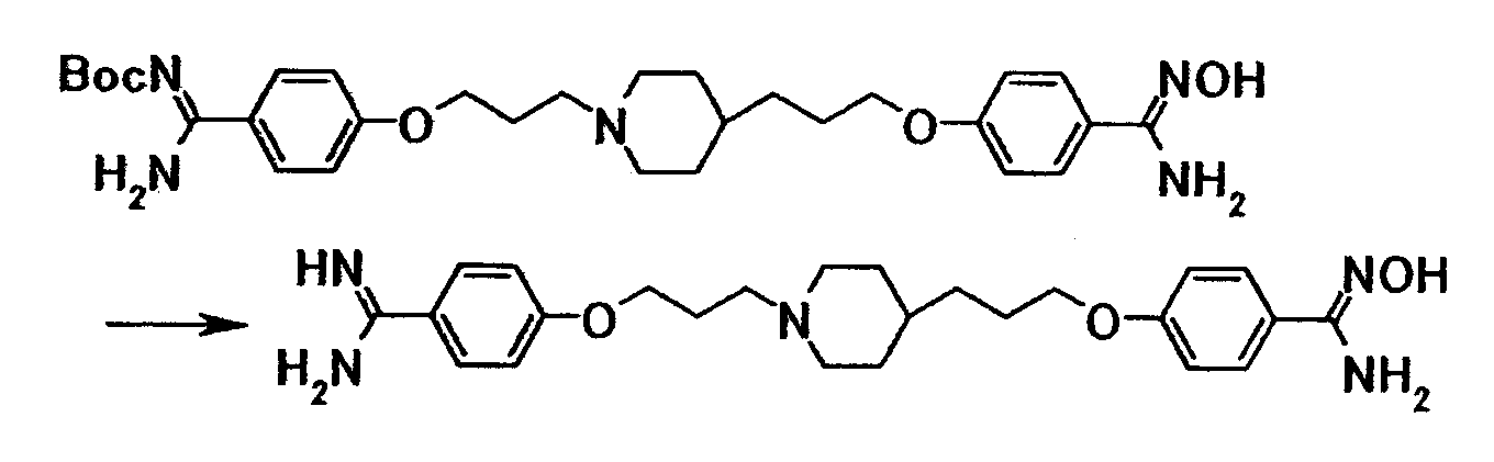 К суспензии 0,30 г трет-бутил[1-амино-1-(4-{3-[4-(3-{4–[амино(гидроксиимино)метил]фенокси}пропил)-1-пиперидинил]пропокси}фенил)метилиден]карбамата в этаноле (5 мл) добавляли при комнатной температуре 5 мл хлористоводородной кислоты, затем смесь перемешивали при указанной температуре в течение 15 часов. Растворитель отгоняли при пониженном давлении и затем к полученному остатку добавляли воду, затем полученную смесь доводили до pH 12,5 при помощи 1 моль/л водного раствора гидроксида натрия. Осадок собирали фильтрованием и промывали водой с получением 0,22 г 4-{3-[4-(3-{4-[амино(гидроксиимино)метил]фенокси}пропил)-1-пиперидинил]пропокси}бензамидина в виде белого твердого вещества.