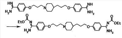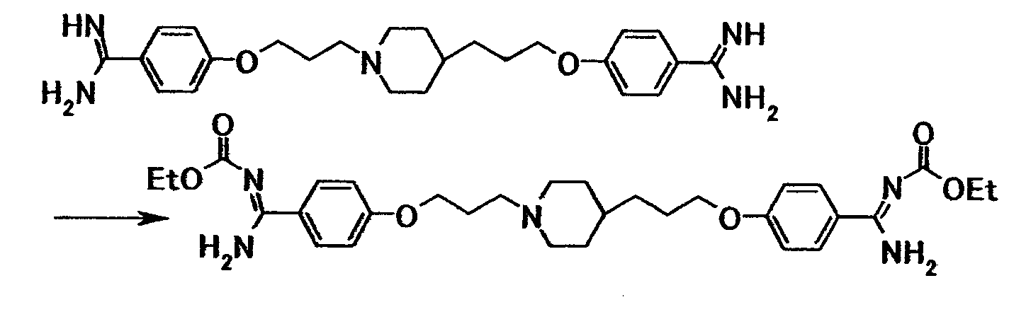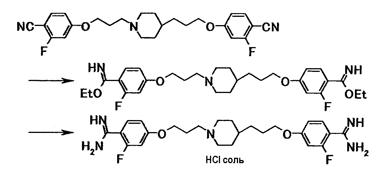 К суспензии 0,50 г 4-{3-[4-(3-{4-[амино(имино)метил]фенокси}пропил)-1-пиперидинил]пропокси}бензамидина в N,N-диметилформамиде (10 мл) добавляли при комнатной температуре 0,60 г этил-4-нитрофенилкарбоната, полученную смесь затем перемешивали при указанной температуре в течение 2 часов и 30 минут. К реакционной смеси добавляли хлороформ и воду. Органический слой отделяли, промывали последовательно водой, 5% водным раствором карбоната калия и насыщенным водным раствором хлорида натрия, затем сушили при помощи безводного сульфата магния с последующей отгонкой растворителя при пониженном давлении. Полученный остаток очищали при помощи колоночной хроматографии на силикагеле (элюент; хлороформ:этанол = 4:1) с получением 0,58 г 4-{3-[4-(3-{4–[амино(этоксикарбонилимино)метил]фенокси}пропил)-1-пиперидинил]пропокси}-N’-(этоксикарбонил}бензамидина в виде белого твердого вещества.
