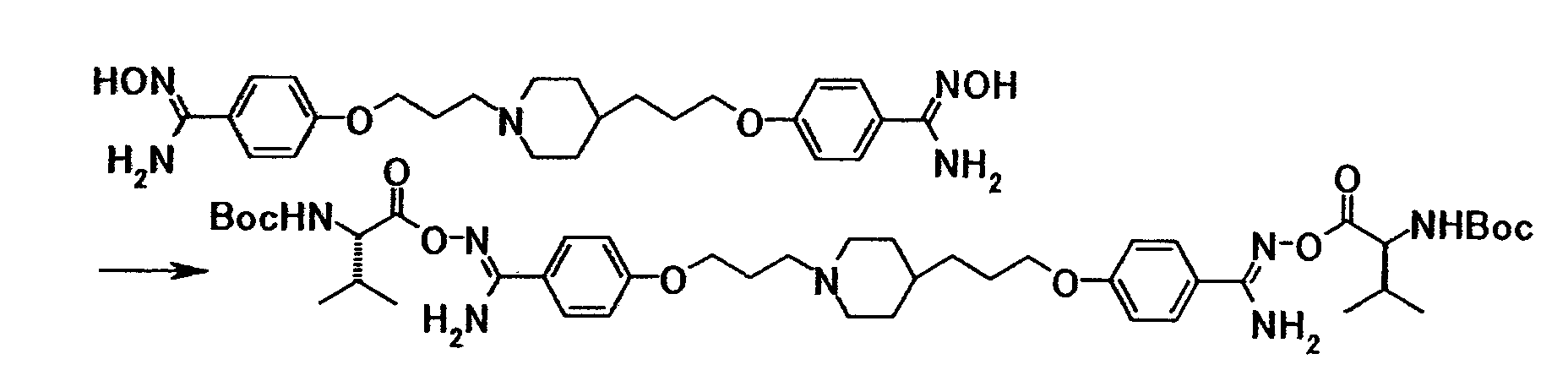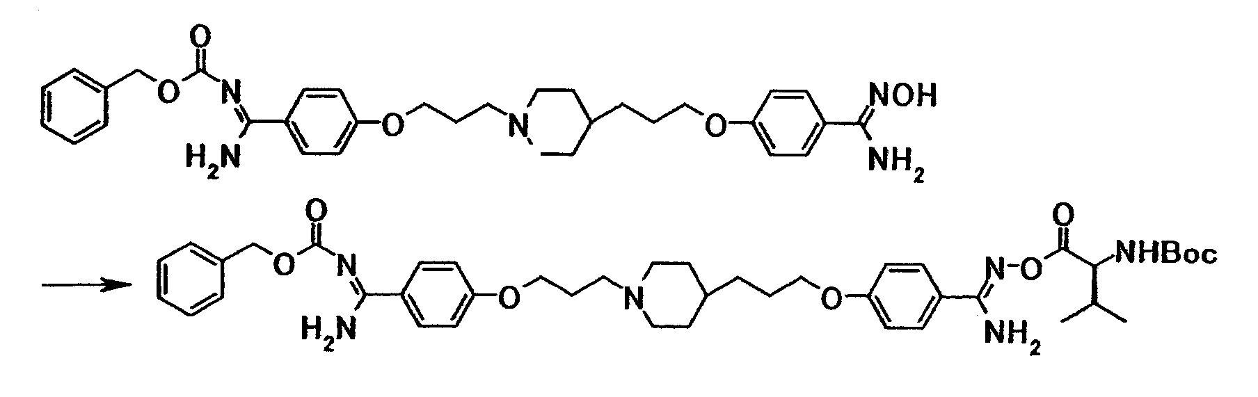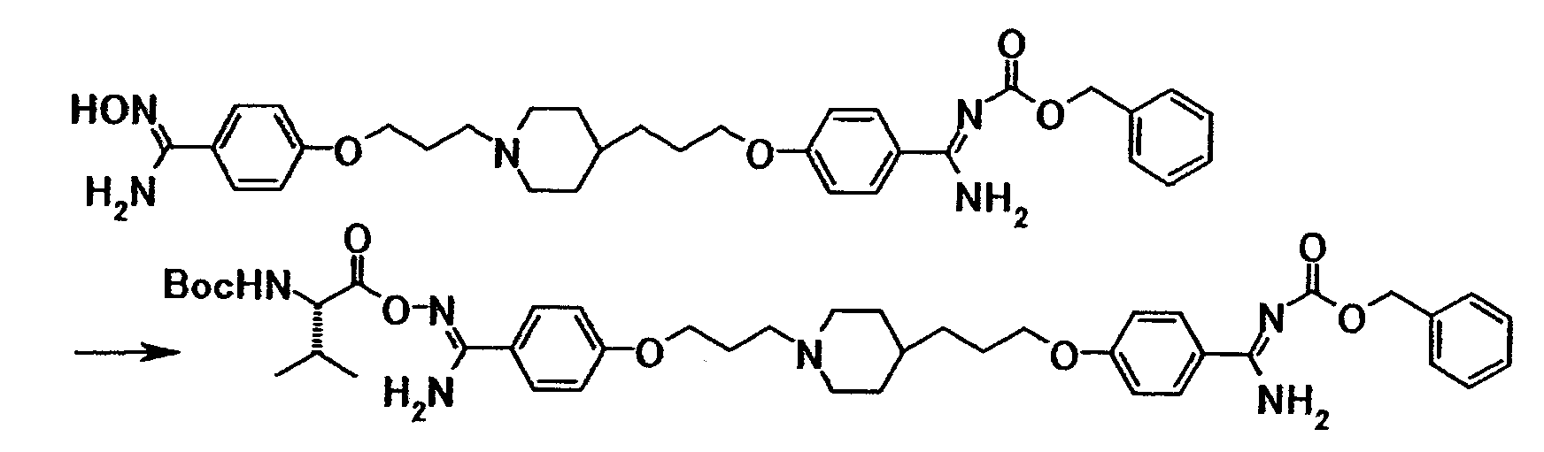 К раствору 44 мг N-(трет-бутоксикарбонил)-L-валина в N-метил-2-пирролидоне (10 мл) добавляли при комнатной температуре 33 мг 1,1′-карбонилдиимидазола, затем полученную смесь перемешивали при указанной температуре в течение 3 часов. К смеси добавляли при комнатной температуре 0,10 г бензил[1-амино-1-(4-{3-[4-(3-{4-[амино(гидроксиимино)метил]фенокси}пропил)-1-пиперидинил]пропокси}фенил)метилиден]карбамата, затем смесь перемешивали при указанной температуре в течение 17 часов. Реакционную смесь добавляли к смеси этилацетата и воды. Органический слой отделяли, промывали водой и затем сушили при помощи безводного сульфата магния с последующей отгонкой растворителя при пониженном давлении. Полученный остаток очищали, используя колоночную хроматографию на силикагеле (элюент; хлороформ:метанол = 30:1), с получением 0,11 г 4-(3-{4-[3-(4-{амино[(2S)-2-(трет-бутоксикарбонил)амино-3-метилбутилилоксиимино]метил}фенокси)пропил]-1-пиперидинил}пропокси)-N’-бензилоксикарбонилбензамидина в виде белого твердого вещества.