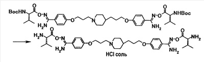 К раствору 0,10 г 4-(3-{4-[3-(4-{амино[(2S)-2-(трет-бутоксикарбонил)амино-3-метилбутилилоксиимино]метил}фенокси)пропил]-1-пиперидинил}пропокси)бензамид О-[(2S)-2-(трет-бутоксикарбонил)амино-3-метилбутилил]оксима в этаноле (2 мл) добавляли при комнатной температуре 5 мл раствора 2,9 моль/л хлористый водород/этанол, полученную смесь затем перемешивали в течение 30 минут. Растворитель отгоняли при пониженном давлении и полученный остаток суспендировали в диизопропиловом эфире, затем твердое вещество собирали фильтрованием, после чего промывали диизопропиловым эфиром с получением 80 мг гидрохлорида 4–{3-[4-(3-{4-[амино((2S)-2-амино-3-метилбутилилоксиимино)метил]фенокси}пропил)-1-пиперидинил]пропокси}бензамид О-((2S)-2-амино-3-метилбутилил)оксима в виде бледно-желтого твердого вещества.
