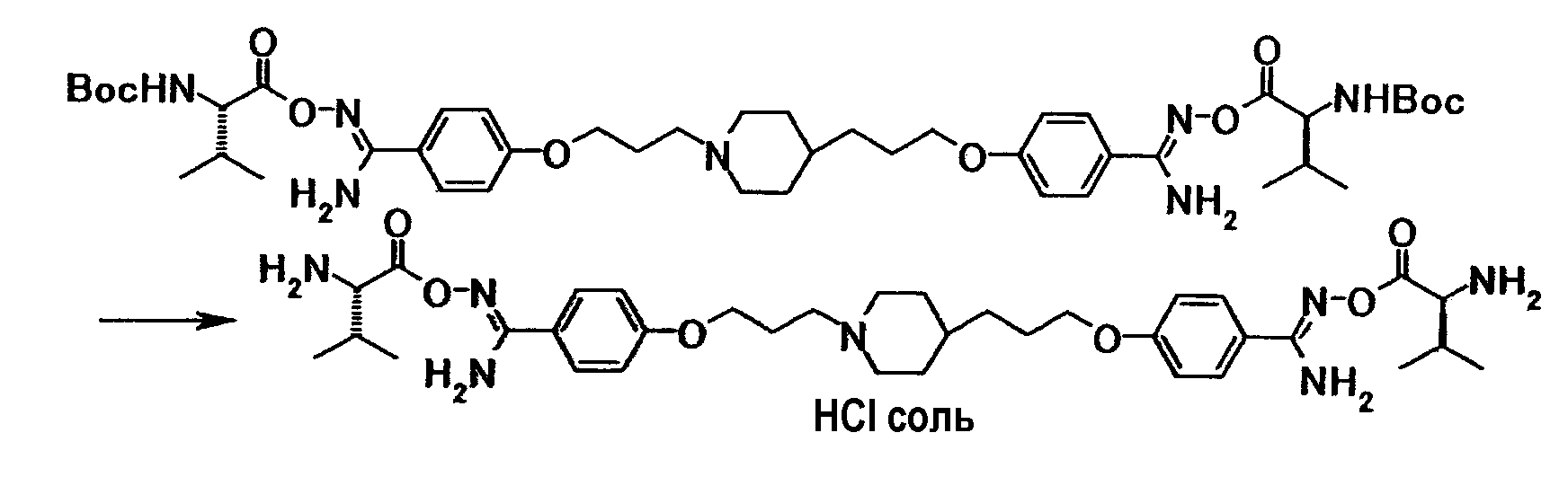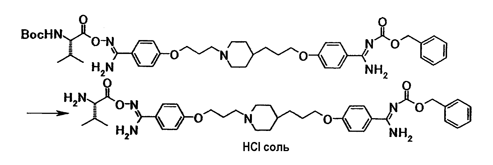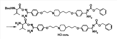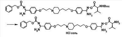 К раствору 0,02 г 4-(3-{4-[3-(4-{амино[(2S)-2-(трет-бутоксикарбонил)амино-3-метилбутилилоксиимино]метил}фенокси)пропил]-1-пиперидинил}пропокси)-N’-бензилоксикарбонилбензамидина в хлороформе (1,0 мл) добавляли при комнатной температуре 0,5 мл трифторуксусной кислоты, полученную смесь затем перемешивали при указанной температуре в течение 2 часов. Растворитель отгоняли при пониженном давлении и затем к полученному остатку добавляли раствор 2,9 моль/л хлористый водород/этанол с последующей отгонкой растворителя при пониженном давлении. Полученный остаток суспендировали в диизопропиловом эфире и твердое вещество собирали фильтрованием и промывали диизопропиловым эфиром с получением 14 мг гидрохлорида 4-{3-[4-(3-{4-[амино((2S)-2-амино-3-метилбутилилоксиимино)метил]фенокси}пропил)-1-пиперидинил]пропокси}-N’-бензилоксикарбонилбензамидина в виде бледно-коричневого твердого вещества.