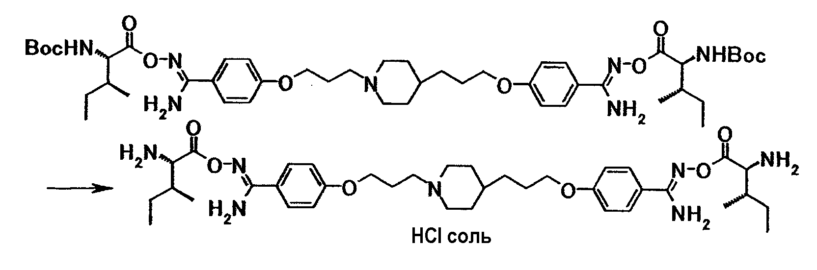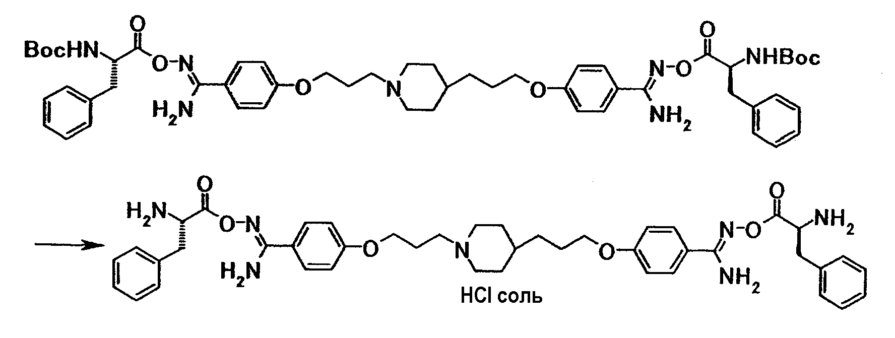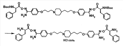К суспензии 0,50 г 4-(3-{4-[3-(4-{амино[(2S)-2-(трет-бутоксикарбонил)амино-3-фенилпропионилоксиимино]метил}фенокси)пропил]-1-пиперидинил}пропокси)-N’-[(2S)-2-(трет-бутоксикарбонил)амино-3-фенилпропионилокси]бензамидина в этаноле (10 мл) добавляли при охлаждении льдом 5 мл раствора 2,9 моль/л хлористый водород/этанол, полученную смесь затем перемешивали при указанной температуре в течение 20 минут, а затем давали выстояться при комнатной температуре в течение 26 часов. Растворитель отгоняли при пониженном давлении и полученный остаток суспендировали в хлороформе, затем твердое вещество собирали фильтрованием с получением 0,50 г гидрохлорида 4-{3-[4-(3-{4-[амино((2S)-2-амино-3-фенилпропионилоксиимино)метил]фенокси}пропил)-1-пиперидинил]пропокси}-N’-((2S)-2-амино-3-фенилпропионилокси)бензамидина в виде бледновато-желтого твердого вещества.
