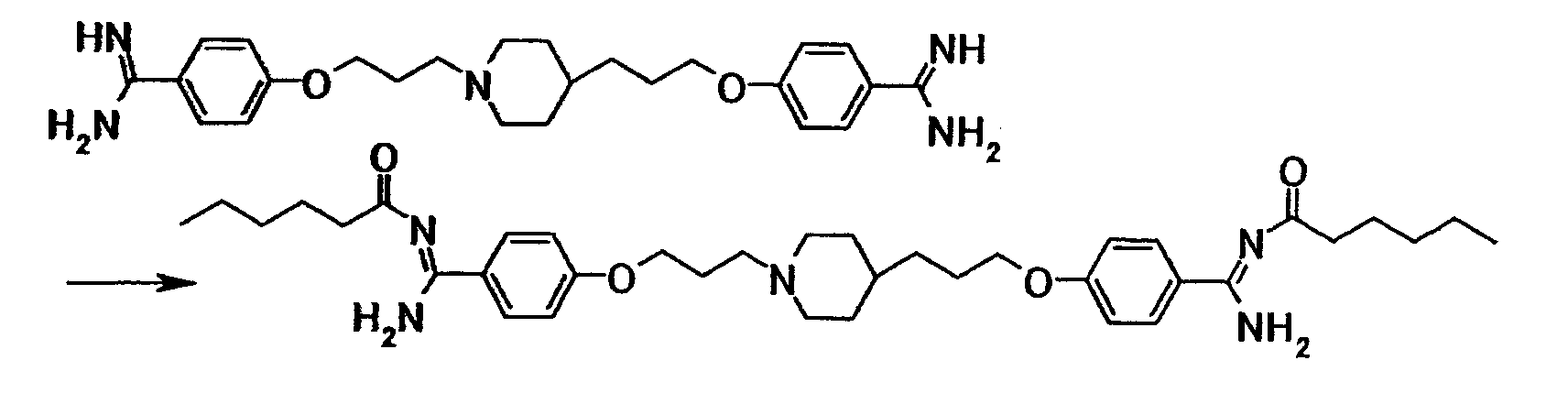 Как описано в примере 29, получали 0,62 г 4-{3-[4–(3-{4-[амино(гексаноилимино)метил]фенокси}пропил)-1-пиперидинил]пропокси}-N’-(гексаноил)бензамидина в виде белого твердого вещества исходя из 0,50 г 4-{3-[4-(3-{4–[амино(имино)метил]фенокси}пропил)-1-пиперидинил]пропокси}бензамидина и 0,68 г 4-нитрофенилгексаноата.