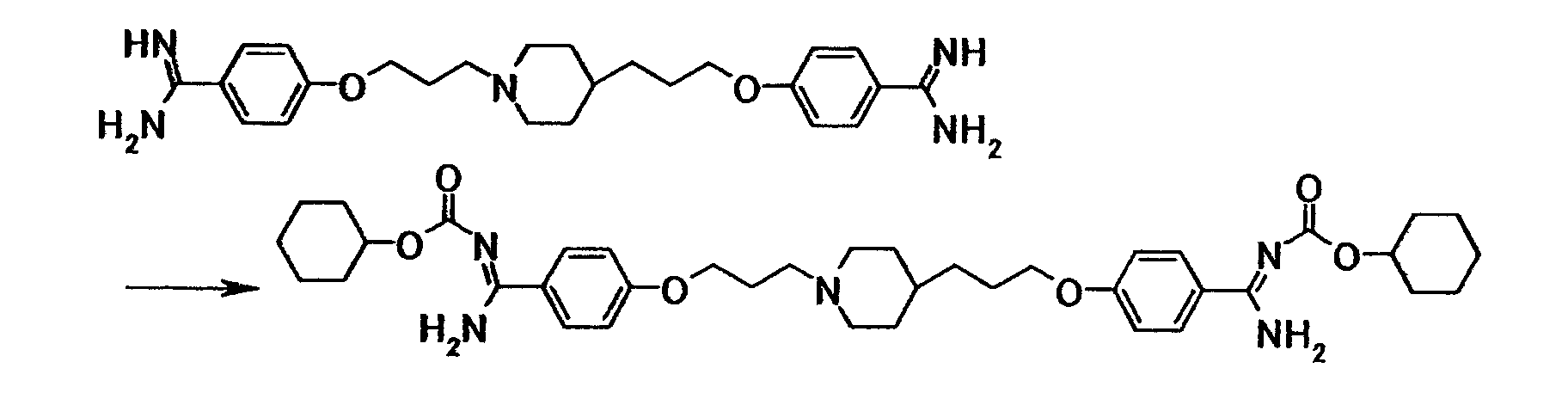 Как описано в примере 31, получали 0,33 г 4-{3-[4-(3-{4-[амино(циклогексилоксикарбонилимино)метил]фенокси}пропил)-1-пиперидинил]пропокси}-N’-(циклогексилоксикарбонил)бензамидина в виде белого твердого вещества исходя из 0,50 г 4-{3-[4-(3-{4-[амино(имино)метил}фенокси}пропил)-1-пиперидинил]пропокси}бензамидина и 0,76 г циклогексил-4-нитрофенилкарбоната.