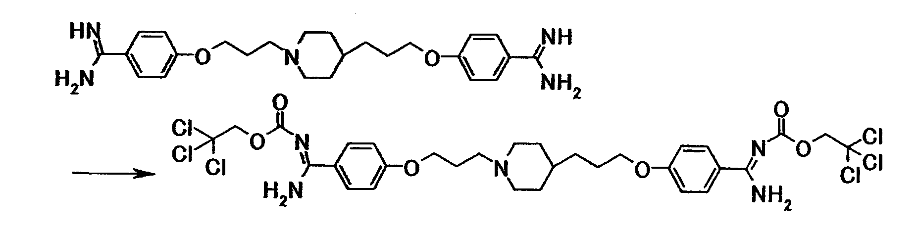 Как описано в примере 31, получали 0,72 г 4-{3-[4-(3-{4-[амино(2,2,2-трихлорэтоксикарбонилимино)метил]фенокси}пропил)-1-пиперидинил}пропокси}-N’-(2,2,2-трихлорэтоксикарбонил)бензамидина в виде белого твердого вещества исходя из 0,50 г 4-{3-[4-(3-{4-[амино(имино)метил]фенокси}пропил)-1-пиперидинил]пропокси}бензамидина и 0,90 г 4-нитрофенил-2,2,2-трихлорэтилкарбоната.